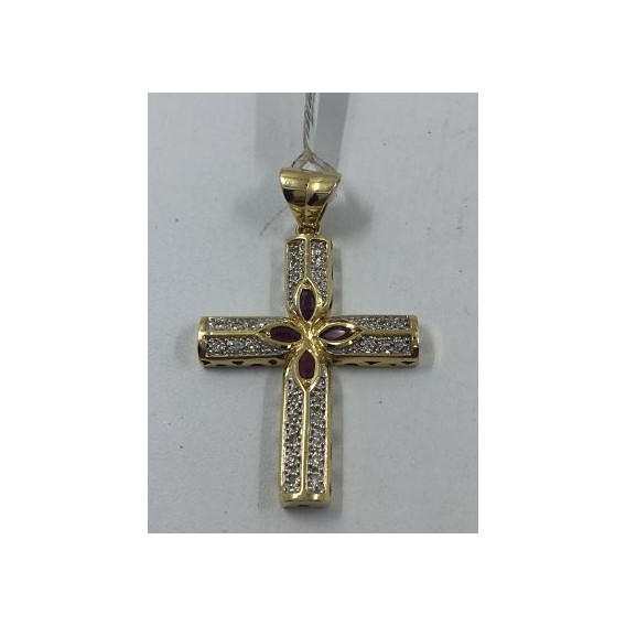 Colgante cruz de segunda mano en oro de 18 kt., brillantes y rubíes. Peso: 8 g. Medidas: 3,5 x 2,7 cm.