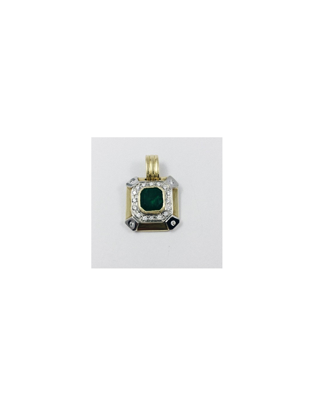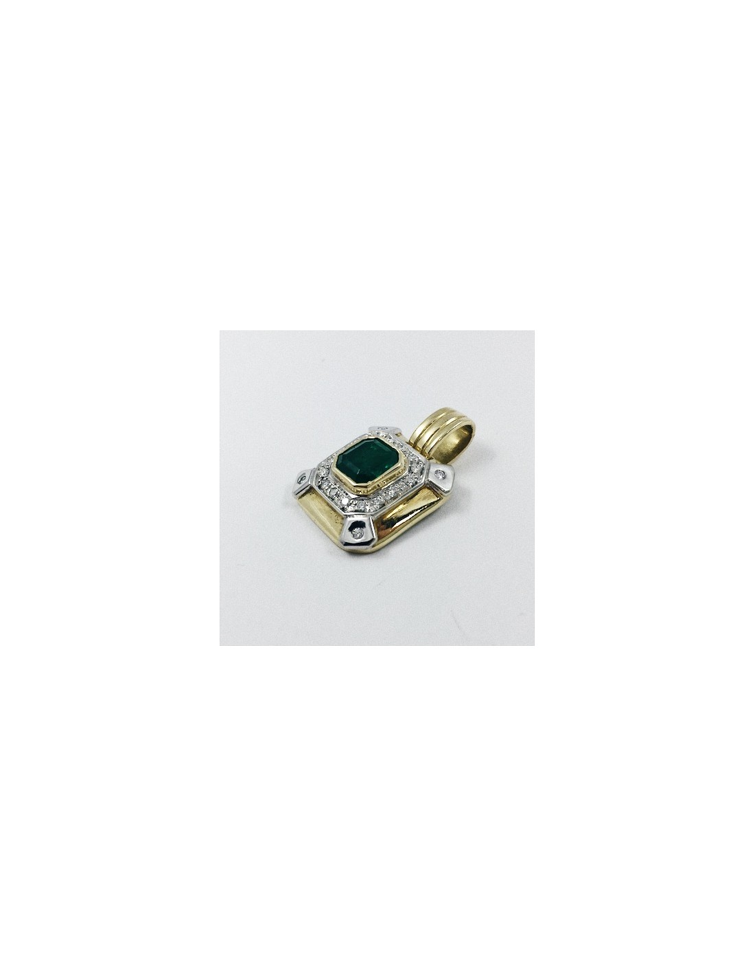 Colgante de segunda mano en oro amarillo de 18 kt. con brillantes y esmeralda. Peso: 8,5 g.