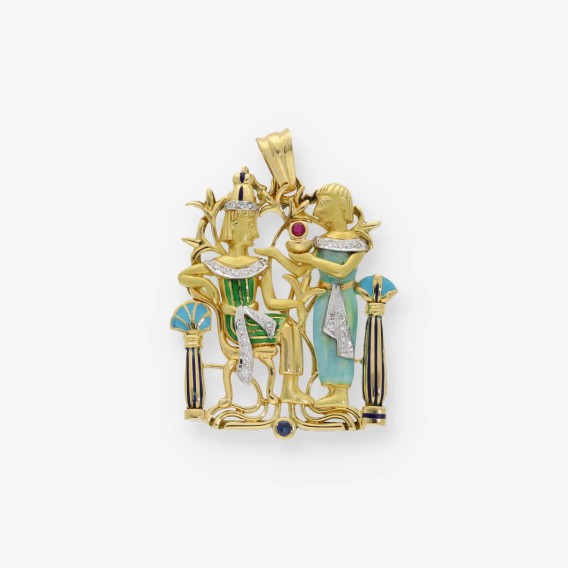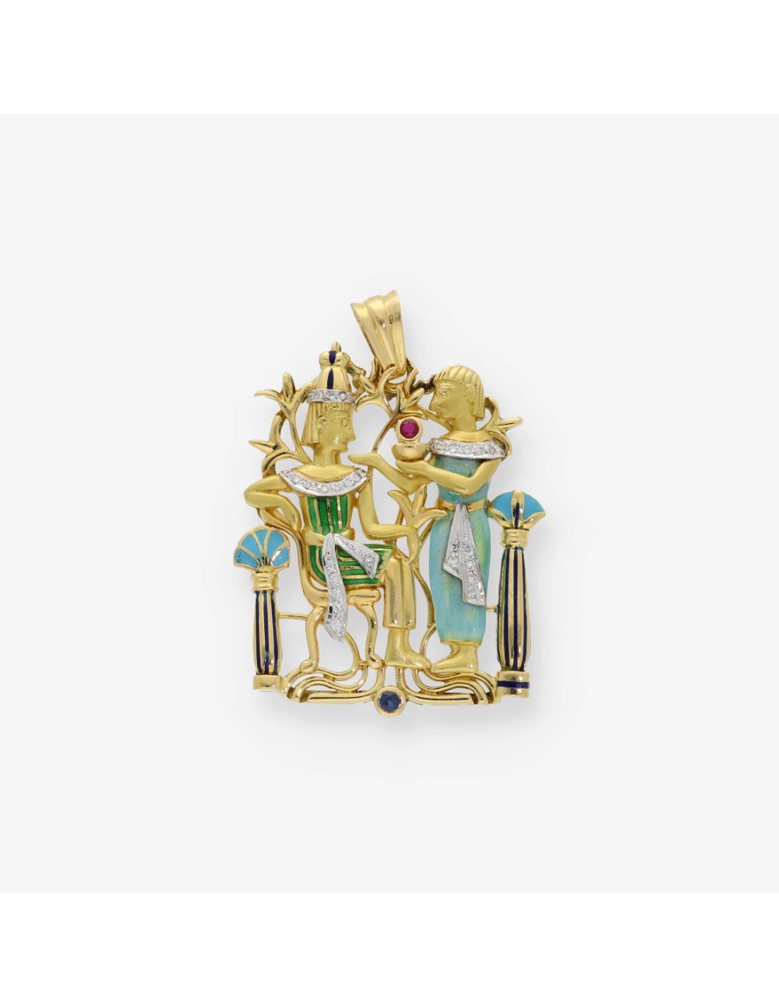 Colgante en oro amarillo de primera ley con brillantes y esmalte. Una pieza espectacular, ideal para los amantes de joyas coleccionables. Ancho: 4cm. Alto: 5.3cm. Peso: 25.2gr.