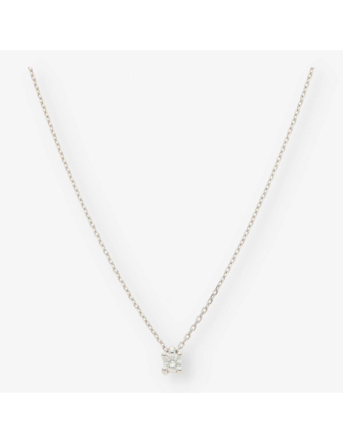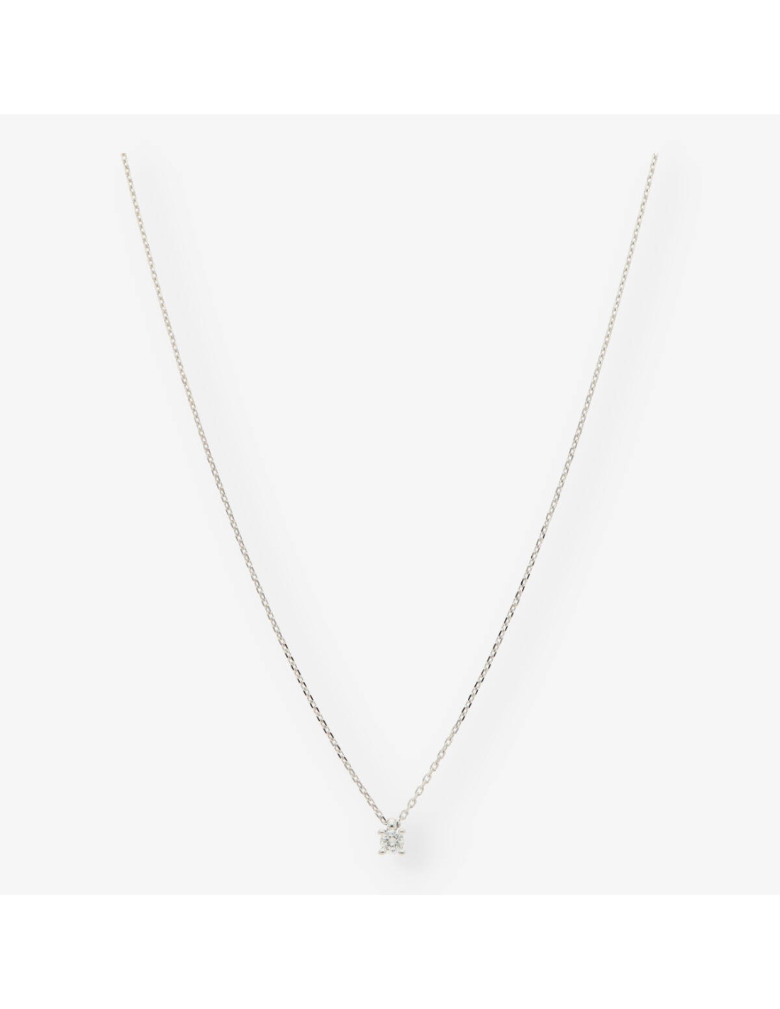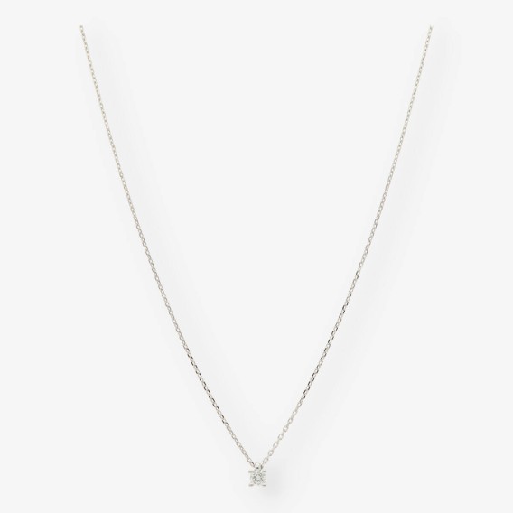 Colgante nuevo en oro blanco de primera ley con un magnífico diamante central en talla brillante de 0,15 quilates aprox.. Longitud maxima: 45cm. Longitud mínima: 42cm.