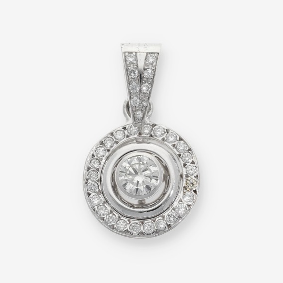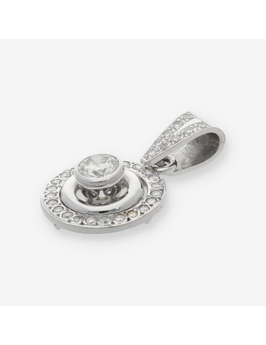 Precioso colgante circular de segunda mano en oro blanco de primera ley con brillante central y alrededor (1qt aprox). Un regalo ideal para los amantes de las joyas. Largo: 2.7cm. diámetro: 1.6cm. Peso: 6.06gr