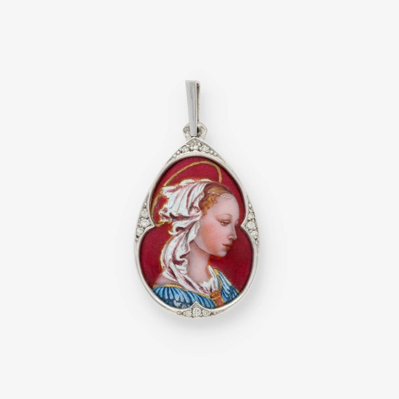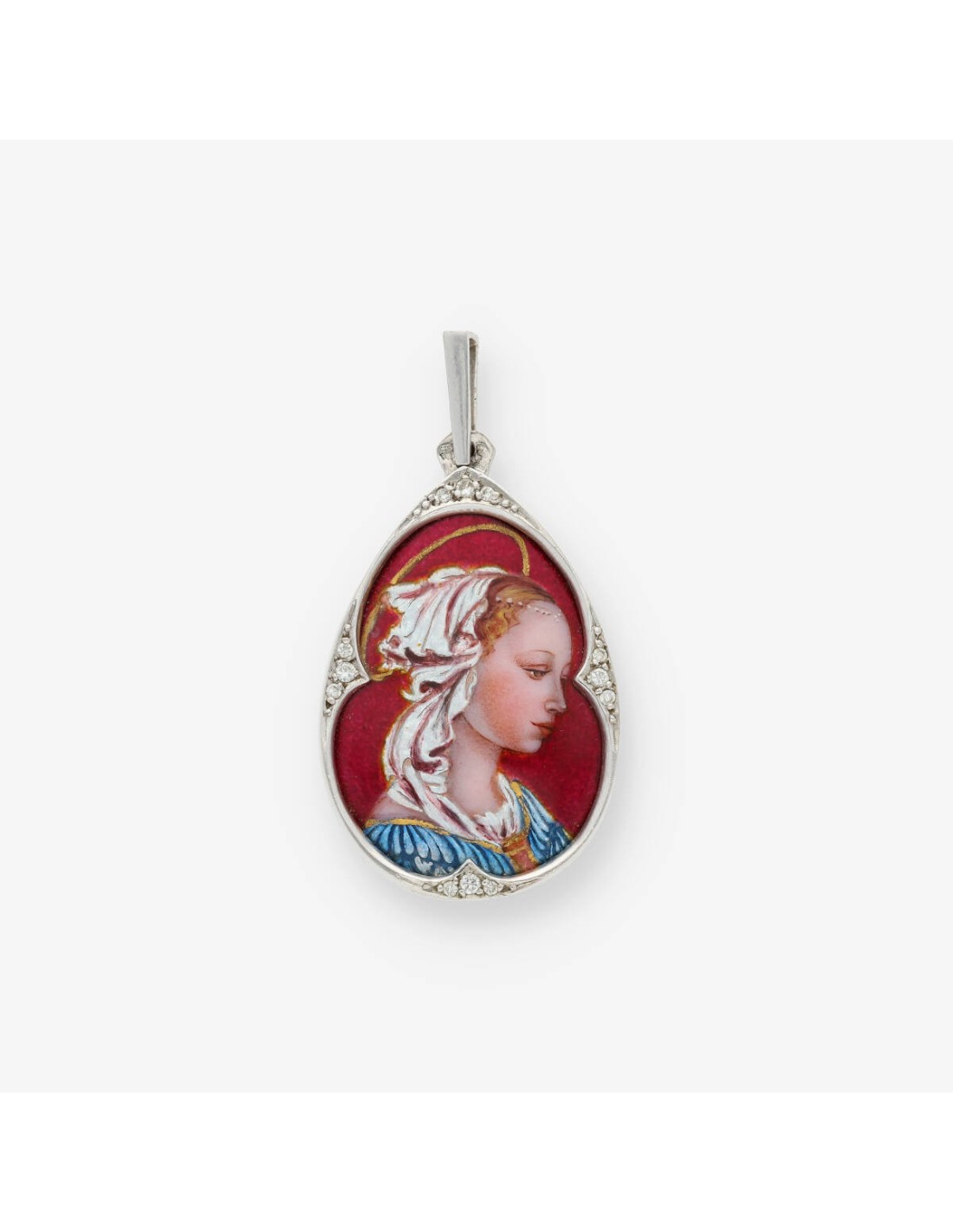Colgante medalla de segunda mano en oro blanco de primera ley y esmalte con imagen de la Virgen. Alto: 5cm. Ancho: 2.6cm. Peso: 12.5gr.