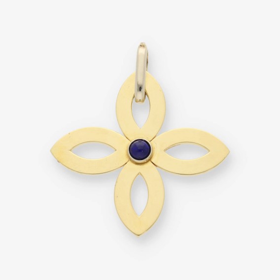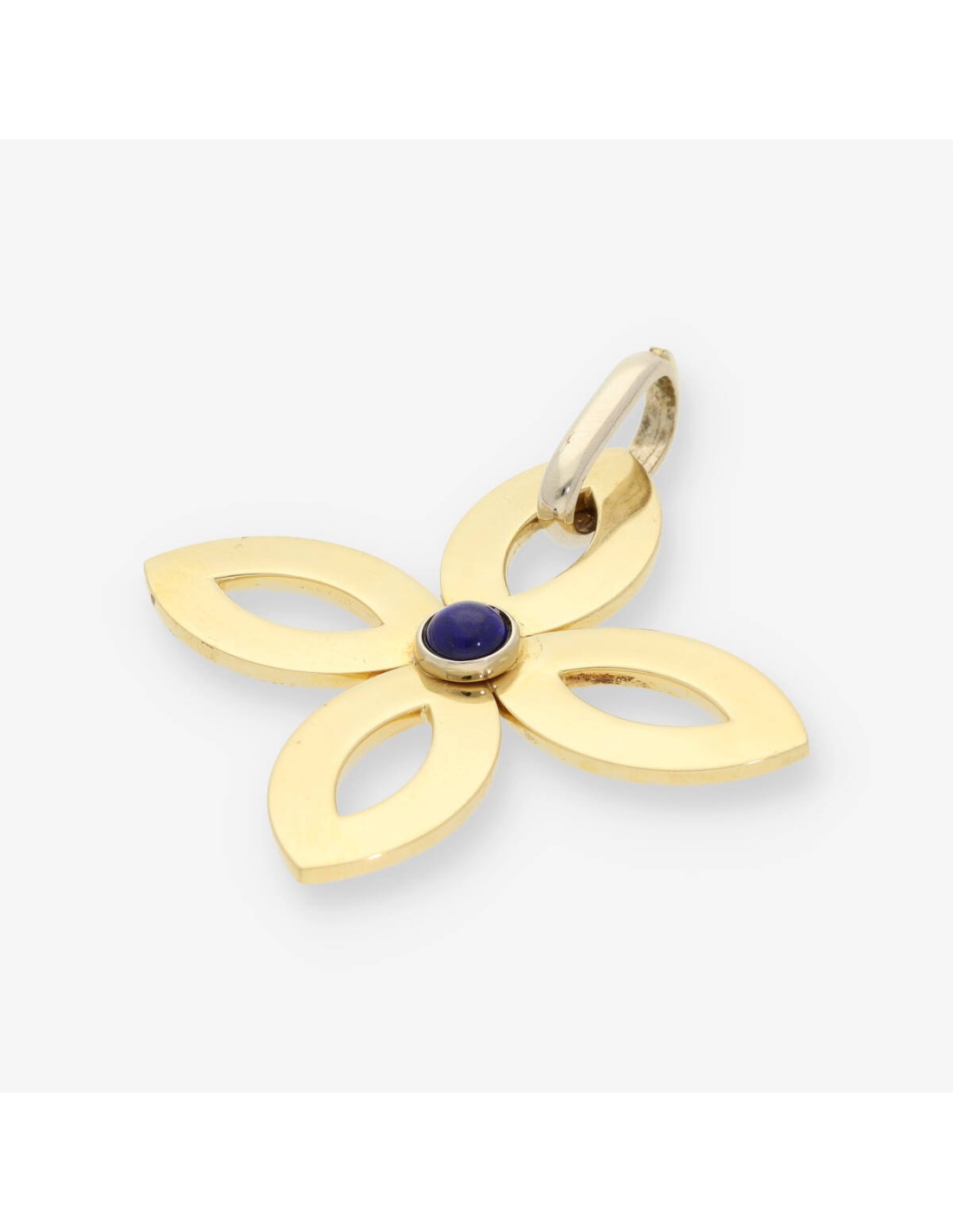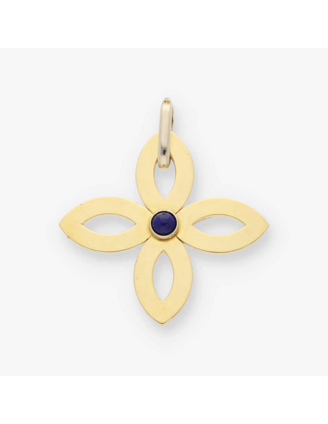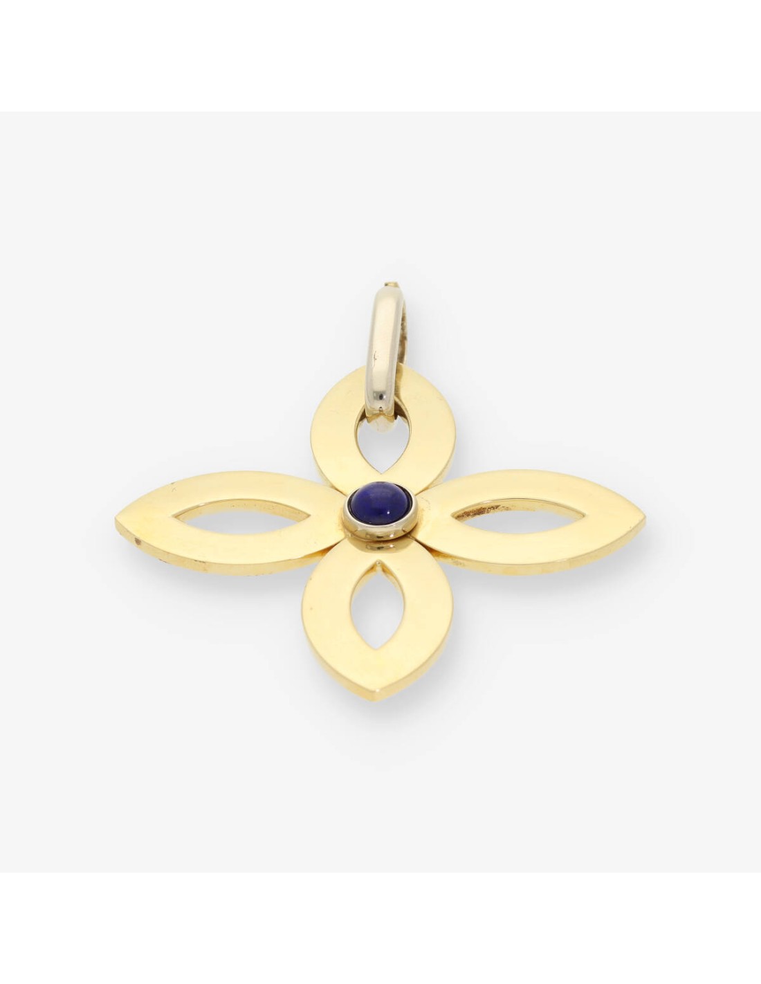 Precioso colgante de segunda mano en oro amarillo de primera ley con piedra central. Alto: 5.3cm. Ancho: 5.3cm. Peso: 10.04gr.