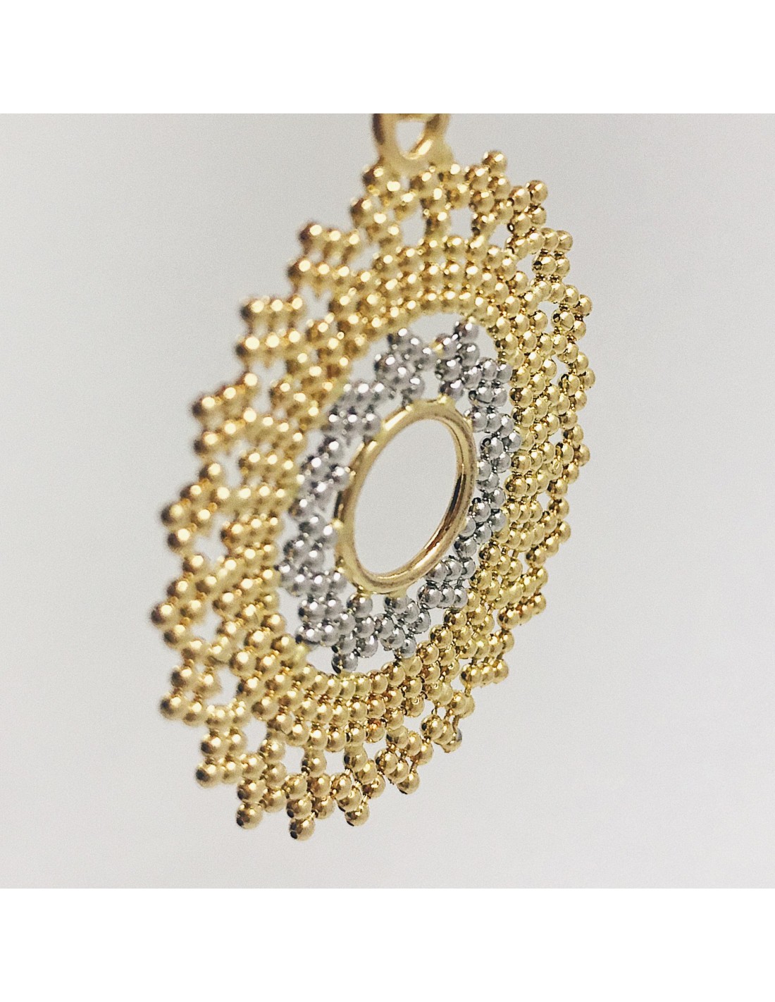 Lindo colgante en forma de sol. Con un maravilloso diseño que trae de vuelta la tradición del ganchillo. Elaborado en oro blanco y amarillo de 18kt. Peso: 4,10gr