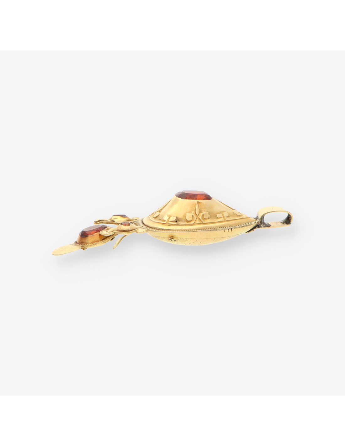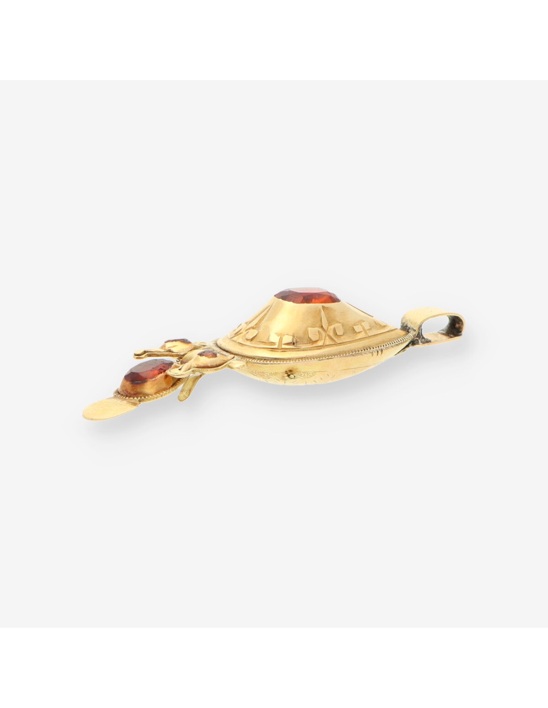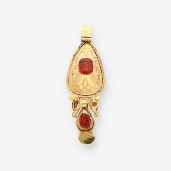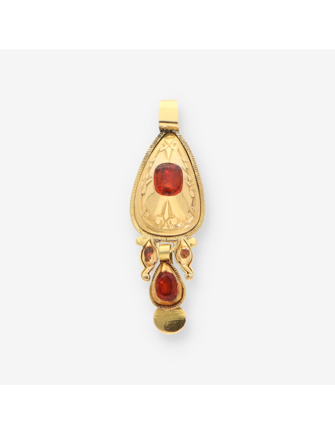 Colgante vintage en oro amarillo de 18kt con diseño clásico y grabados finos, decorado con tres piedras rojas de corte antiguo que aportan elegancia y distinción. Con 5,5 cm de alto y 1,7 cm de ancho, es una pieza llamativa y sofisticada. Con peso de 7,7gr.