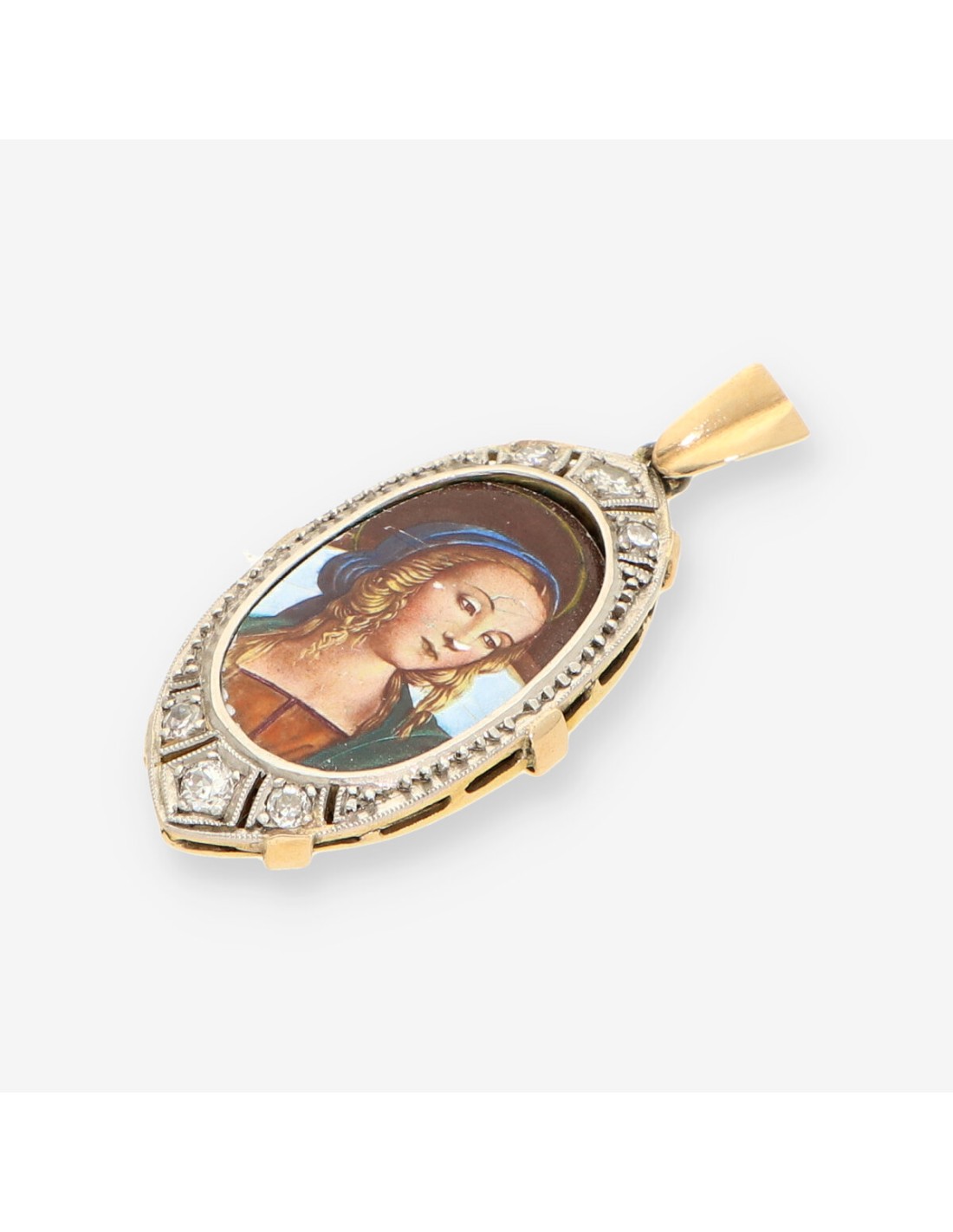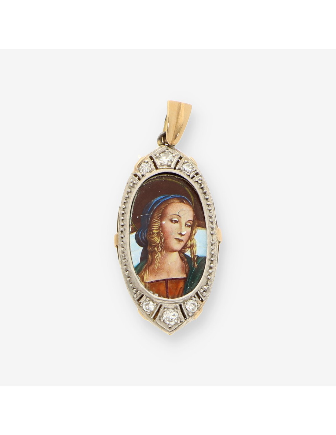 Descubre la combinación perfecta de arte y elegancia con este impresionante colgante de oro de primera ley. Esta pieza única de segunda mano cuenta con un retrato a mano en el centro, rodeado de un marco adornado con brillantes diamantes que realzan su belleza y sofisticación. Este colgante de oro de primera ley no solo embellece tu look, sino que también es una inversión en elegancia y estilo duradero. Alto: 3.3cm. Ancho: 1.5cm. Peso: 3.9gr.