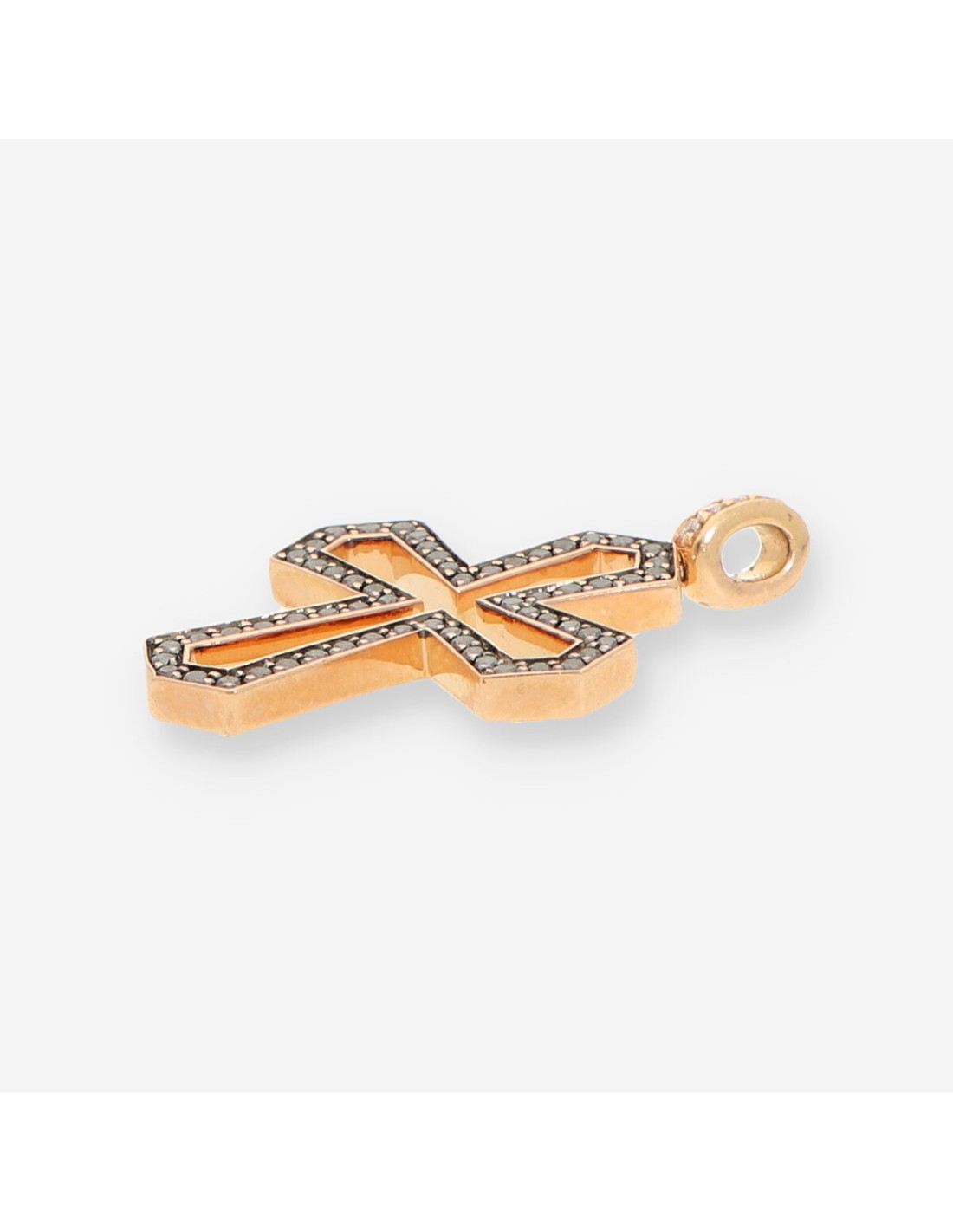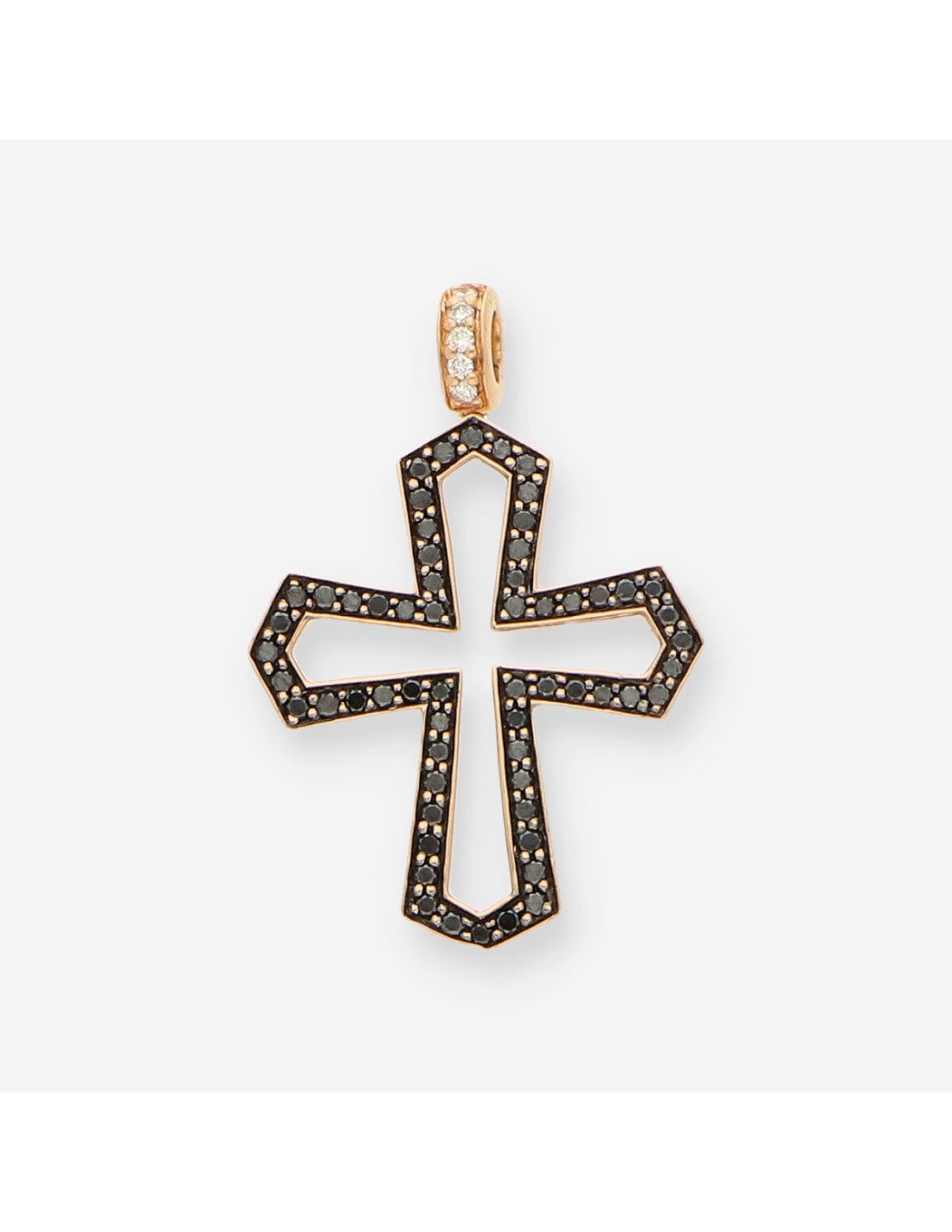 Colgante en forma de cruz elaborado en oro rosa de 18 quilates con brillantes negros engastados en todo el contorno y detalles de diamantes blancos en el asa. Su diseño moderno y sofisticado lo convierte en una pieza única y elegante. Mide 2.8 cm de alto por 1.8 cm de ancho y tiene un peso de 3.8 gramos. Ideal para quienes buscan una joya con estilo y carácter.