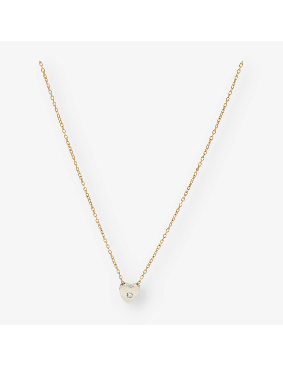 Preciosa gargantilla de segunda mano en oro blanco y amarillo con colgante en forma de corazón. Un perfecto regalo. Longitud: 41cm. Peso: 2.1gr.