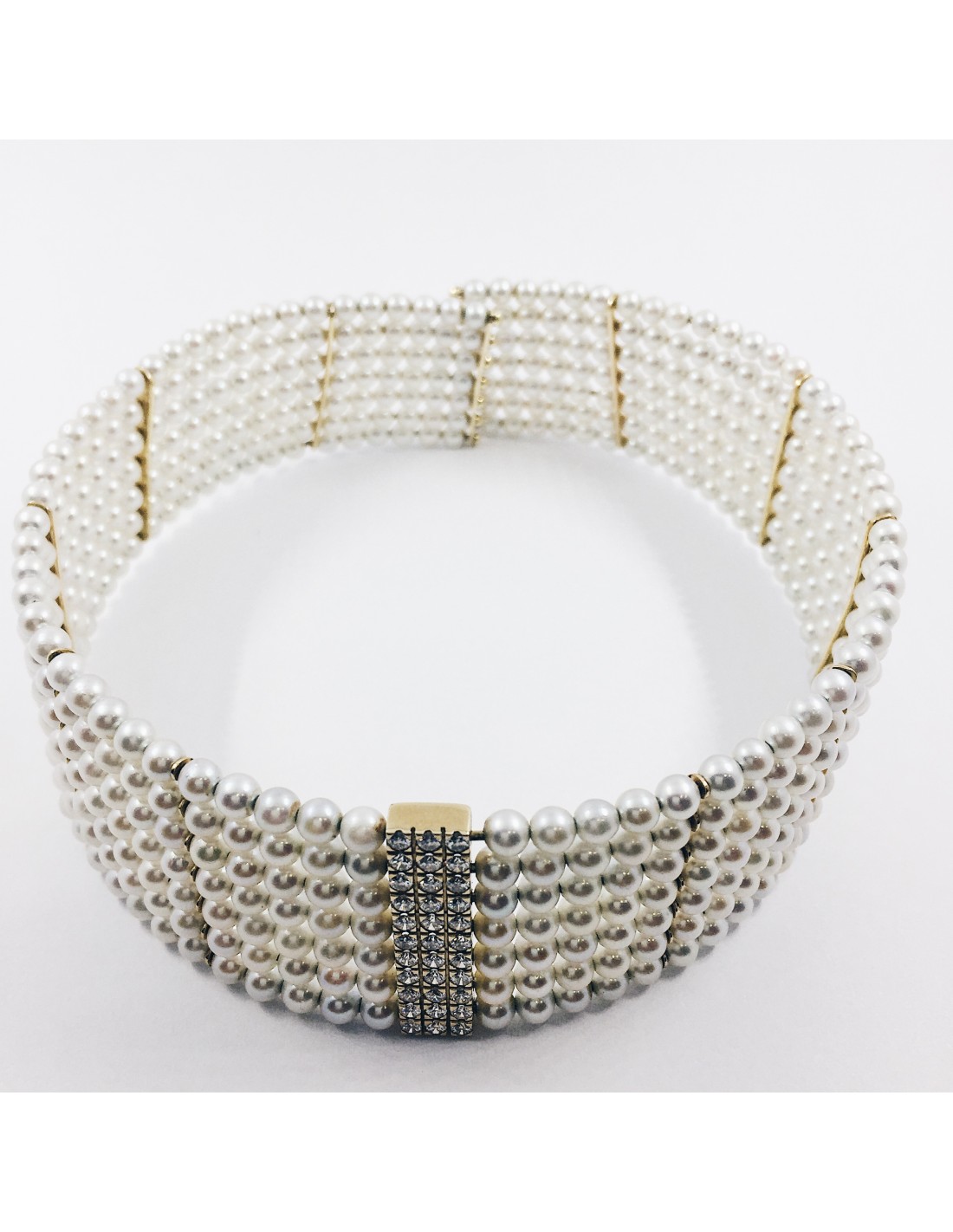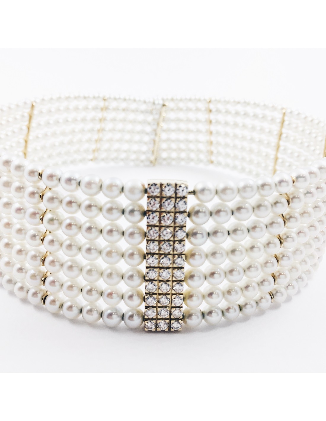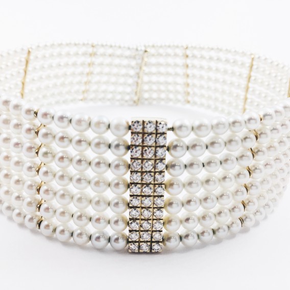 Gargantilla semirígida de segunda mano con 7 filas de perlas con centro de oro de 18 kt. con brillantes. Peso: 85,3 g.