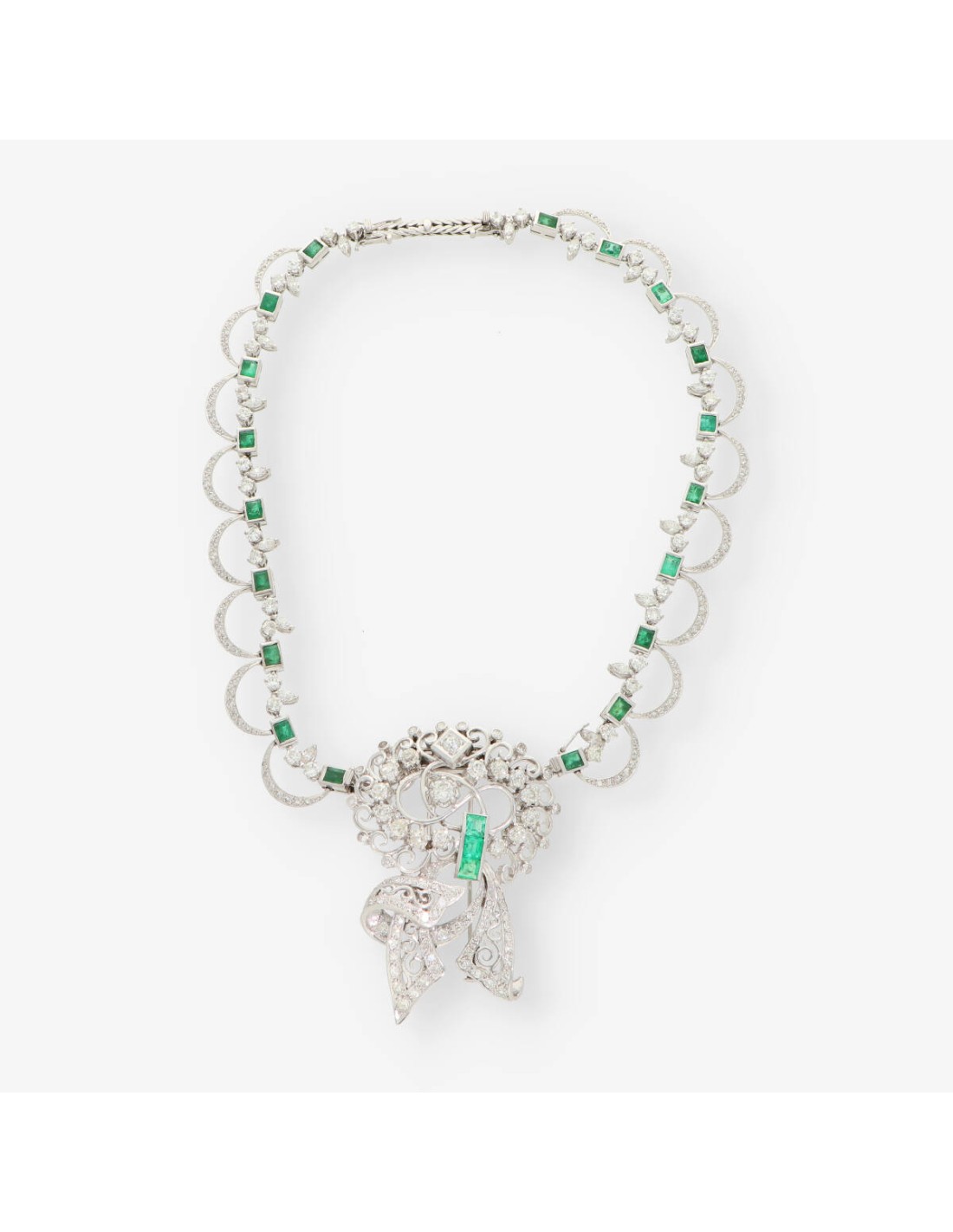 Preciosa gargantilla de segunda mano en oro blanco con brillantes y esmeraldas. Un diseño espectacular, ideal para momentos especiales.  Largo: 38cm. Peso: 79.9gr.