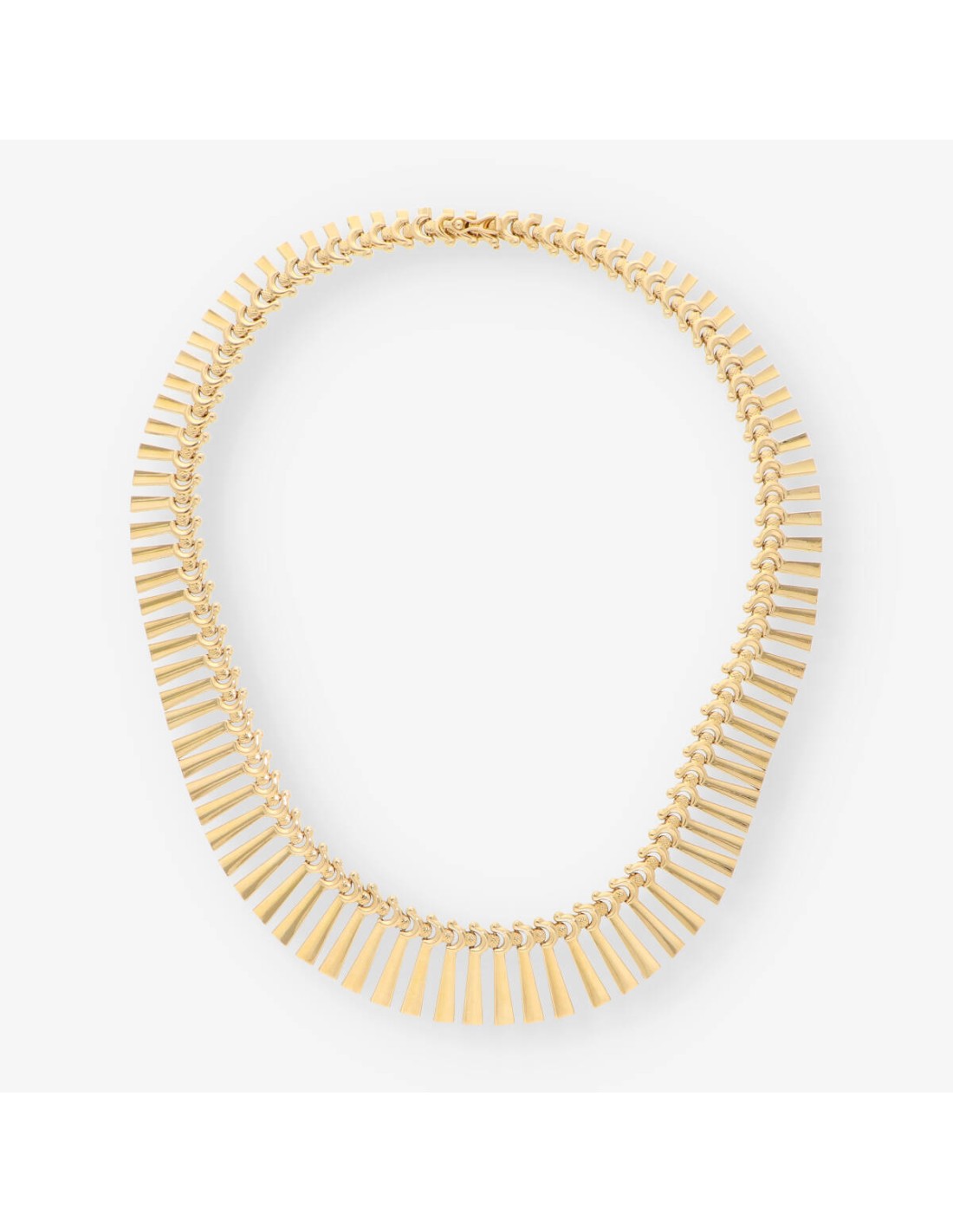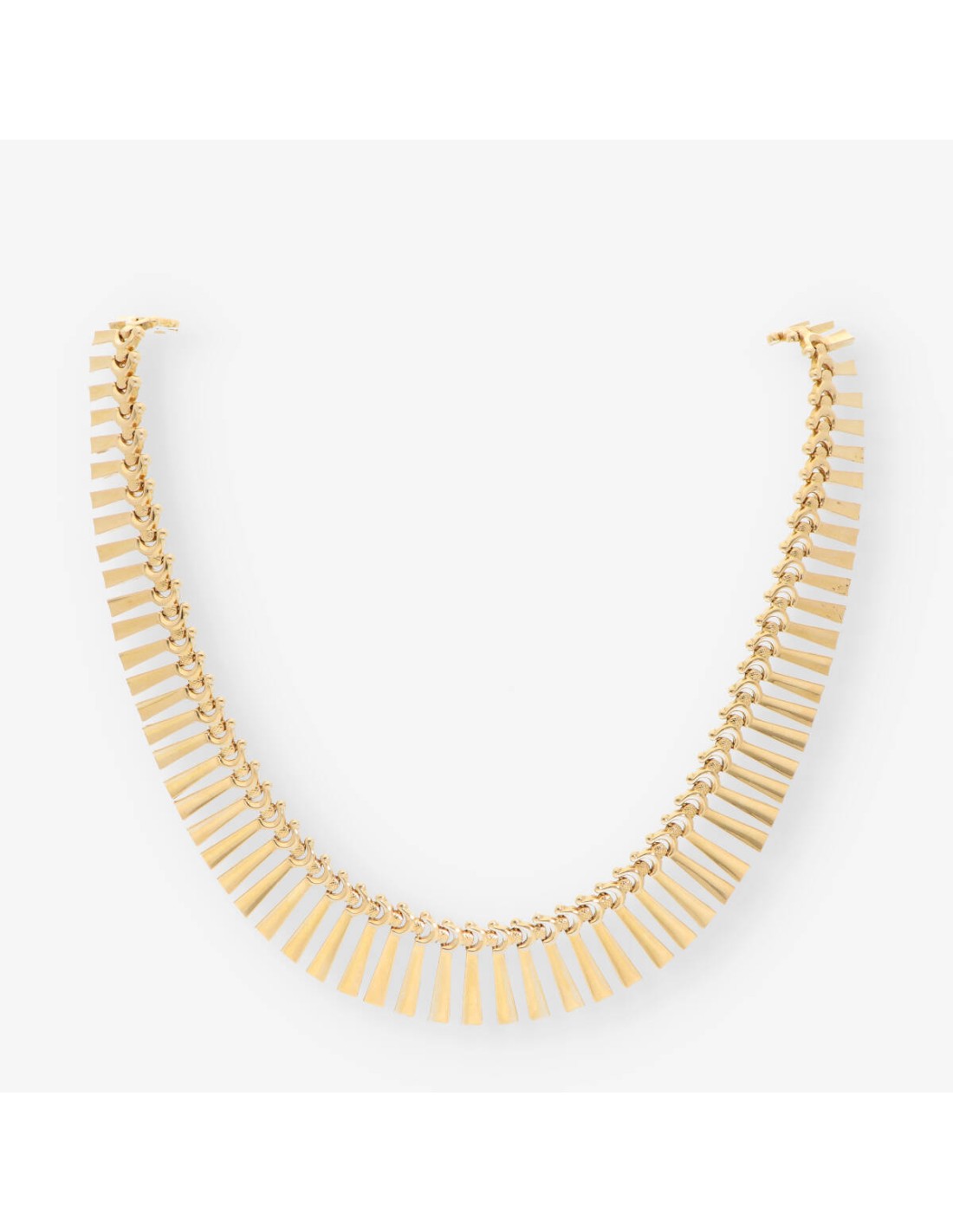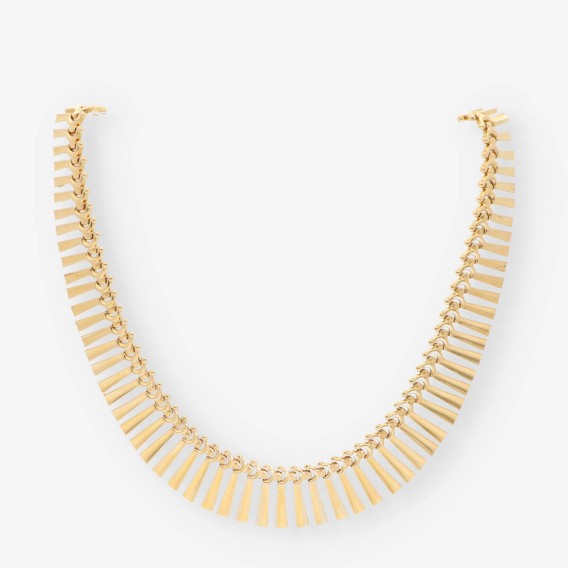 Maravillosa gargantilla de segunda mano en oro amarillo de primera ley. Con un gran diseño que lo vuelve en una pieza perfecta para los amantes de este estilo de joyerías. Longitud: 45.5cm. Peso: 59.72gr.