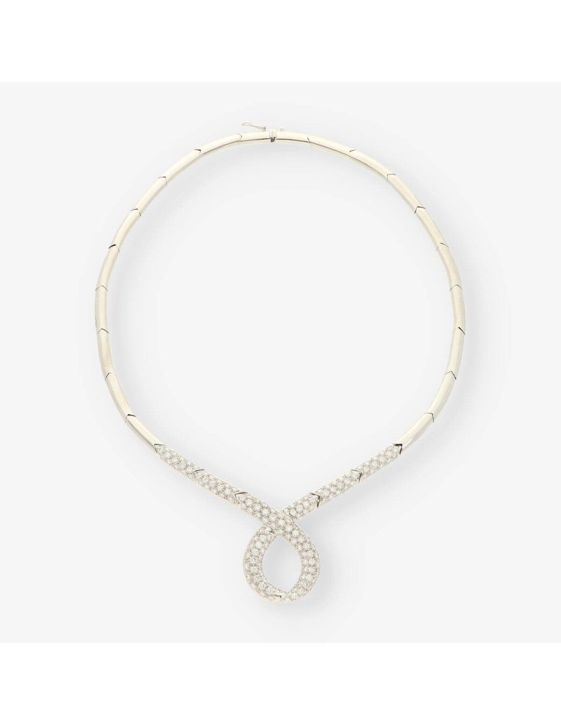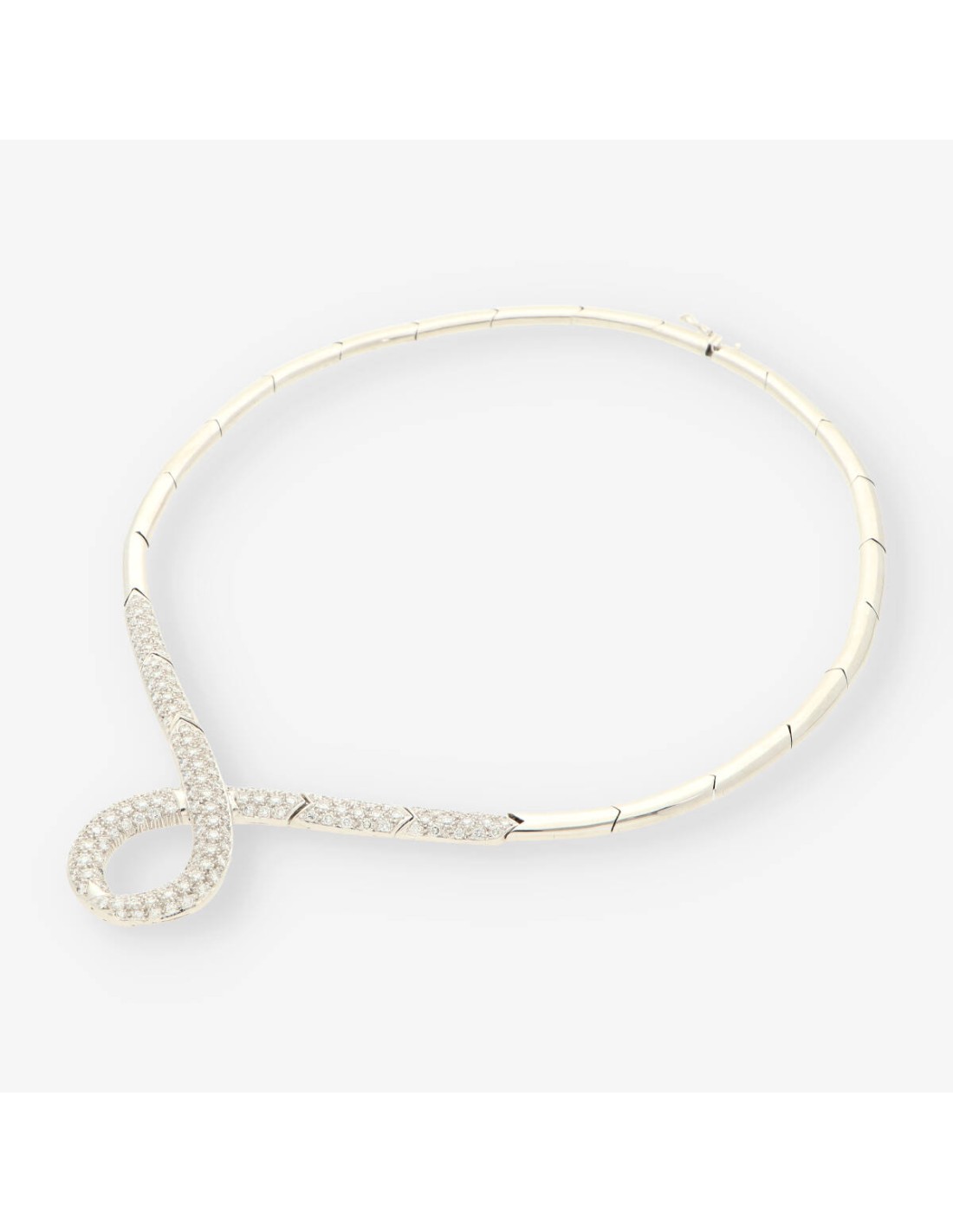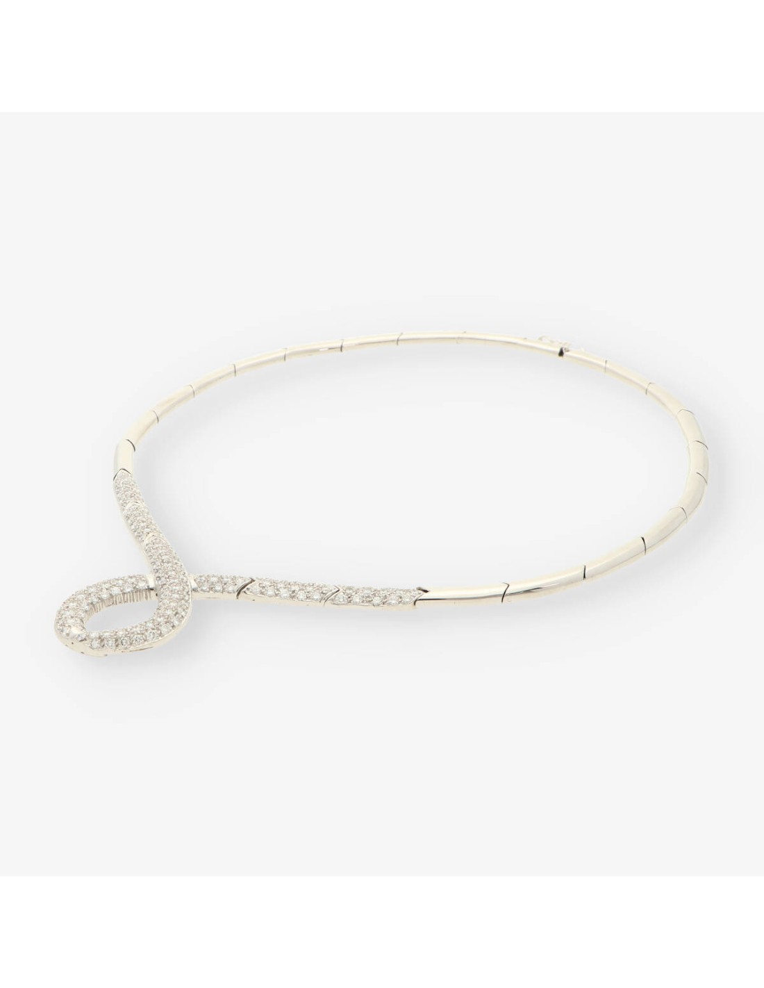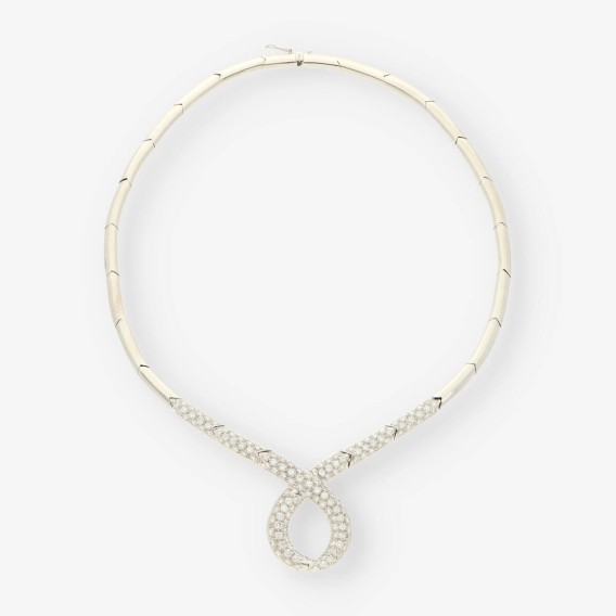 Preciosa gargantilla de segunda mano en oro blanco y brillantes. Diámetro: 15cm. Peso: 48.6gr.