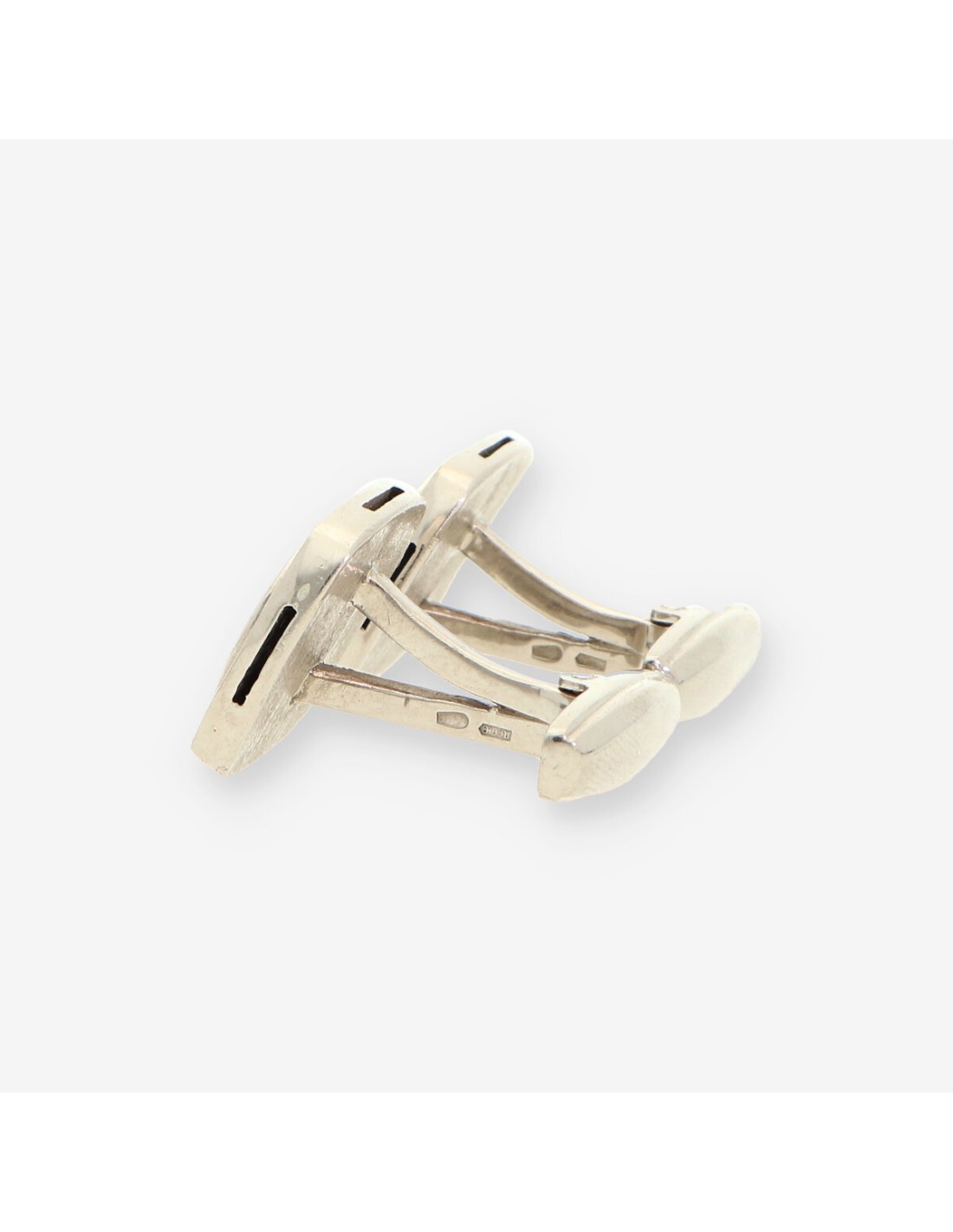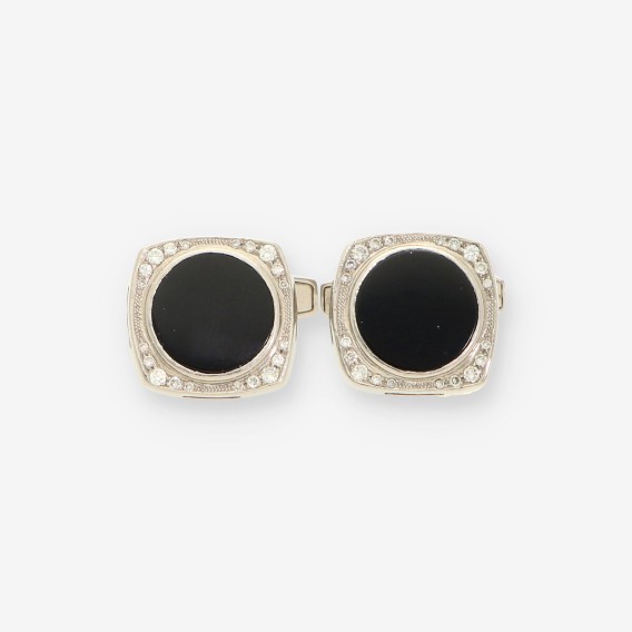 Elegantes gemelos de segunda mano elaborados en oro blanco de 18kt con un diseño sofisticado que combina ónix negro en el centro y un engaste de brillantes que realzan su distinción. Con dimensiones de 1.6 cm de ancho y 1.6 cm de alto, poseen un peso de 15.68 gramos. Una pieza ideal para complementar atuendos formales con un toque de lujo y estilo atemporal.