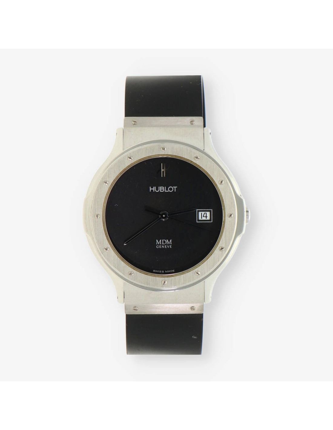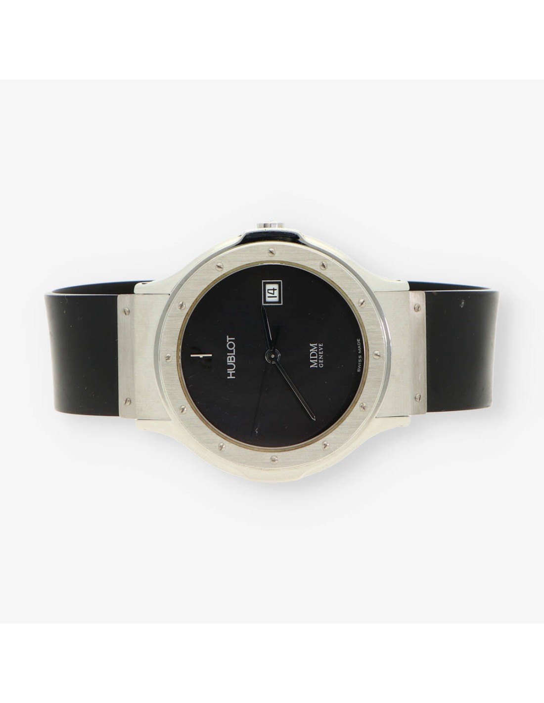 Hublot Classic de segunda mano en acero. Caja con fondo atornillado, cristal zafiro. Esfera color negro con agujas plateadas, fecha a las 3. Mecanismo de Quartz. Diámetro: 36mm. Pulsera original de caucho con cierre desplegable doble.