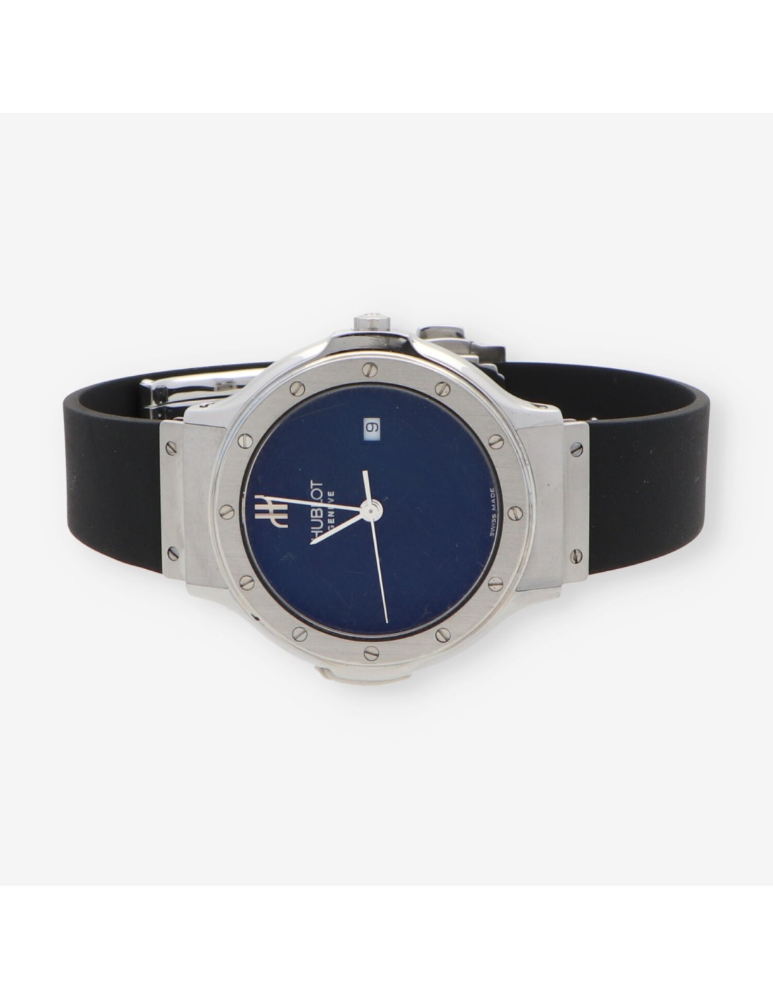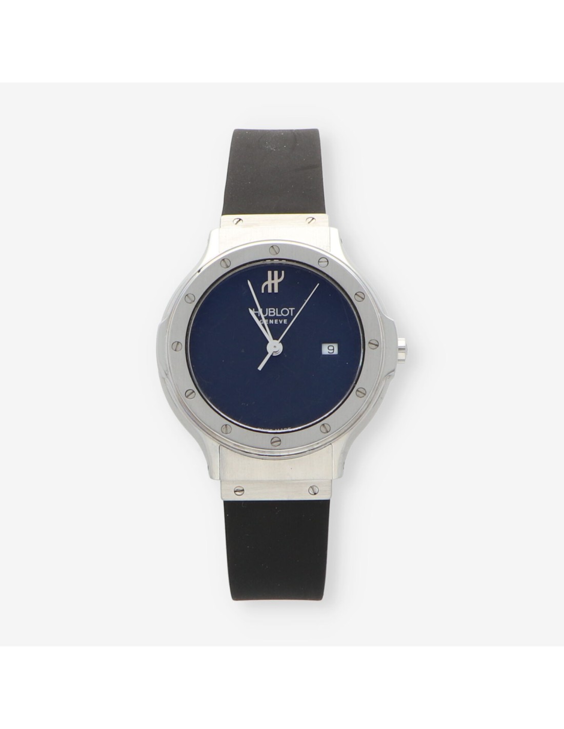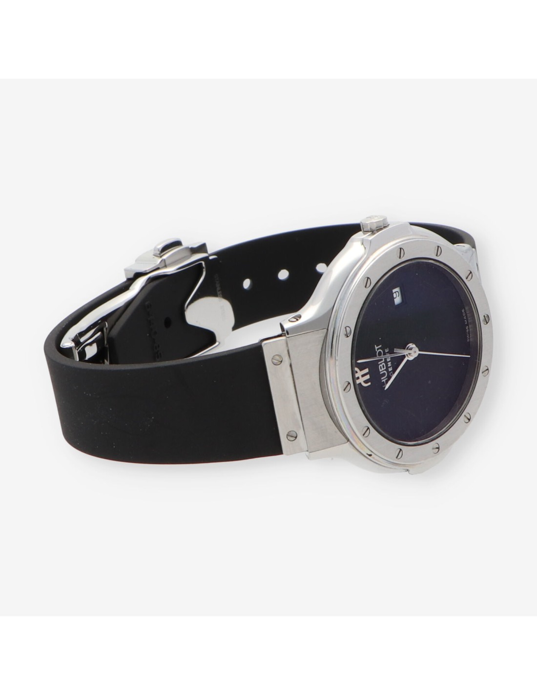 Hublot Clasic de segunda mano en perfecto estado de marcha y conservación. tamaño cadete. Caja de acero con fondo atornillado, cristal zafiro. Esfera negra con agujas plateadas, segundero central, fecha a las 3. Mecanismo de Quartz. Resistente al agua: 5 at. Pulsera original de caucho con cierre desplegable doble en acero. Diámetro: 35 mm.