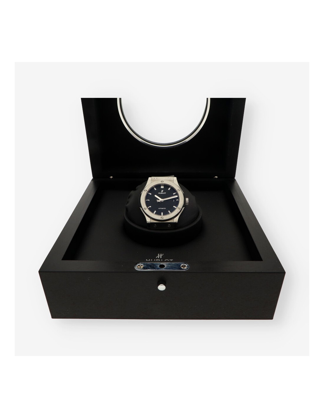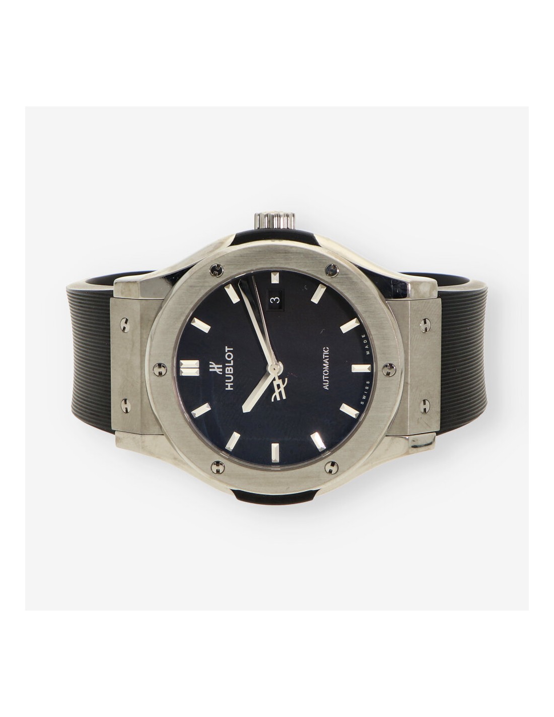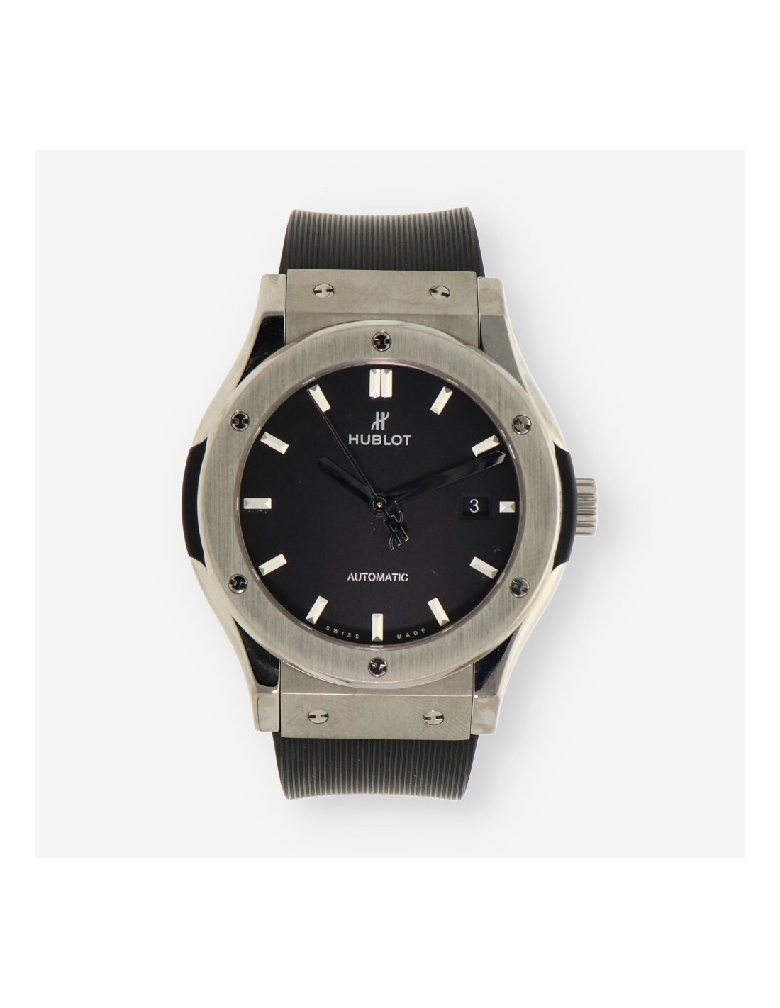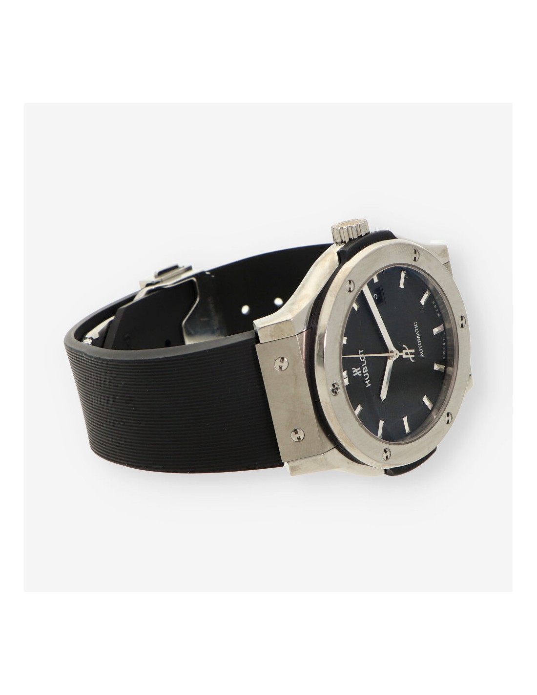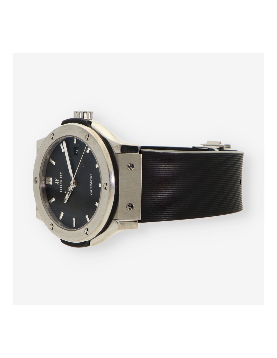 Hublot Clasic Fusion de segunda mano en perfecto estado de marcha y conservación. tamaño 41mm. Caja de acero con fondo atornillado, cristal zafiro. Esfera negra con agujas plateadas, fecha a las 3. Movimiento automático. Pulsera original de caucho negro con cierre desplegable en acero.
