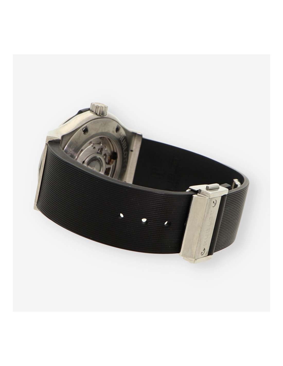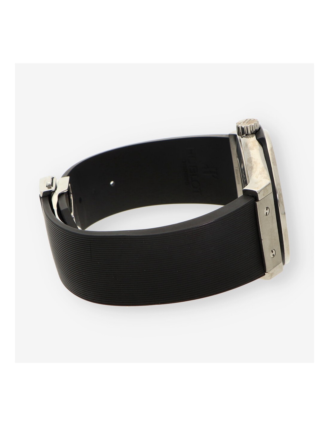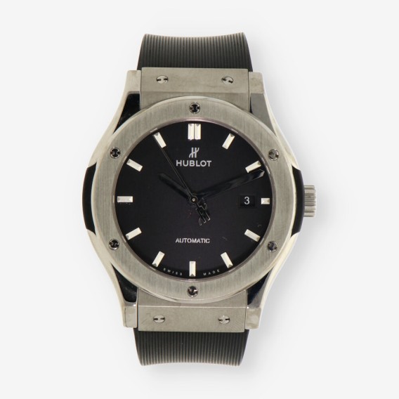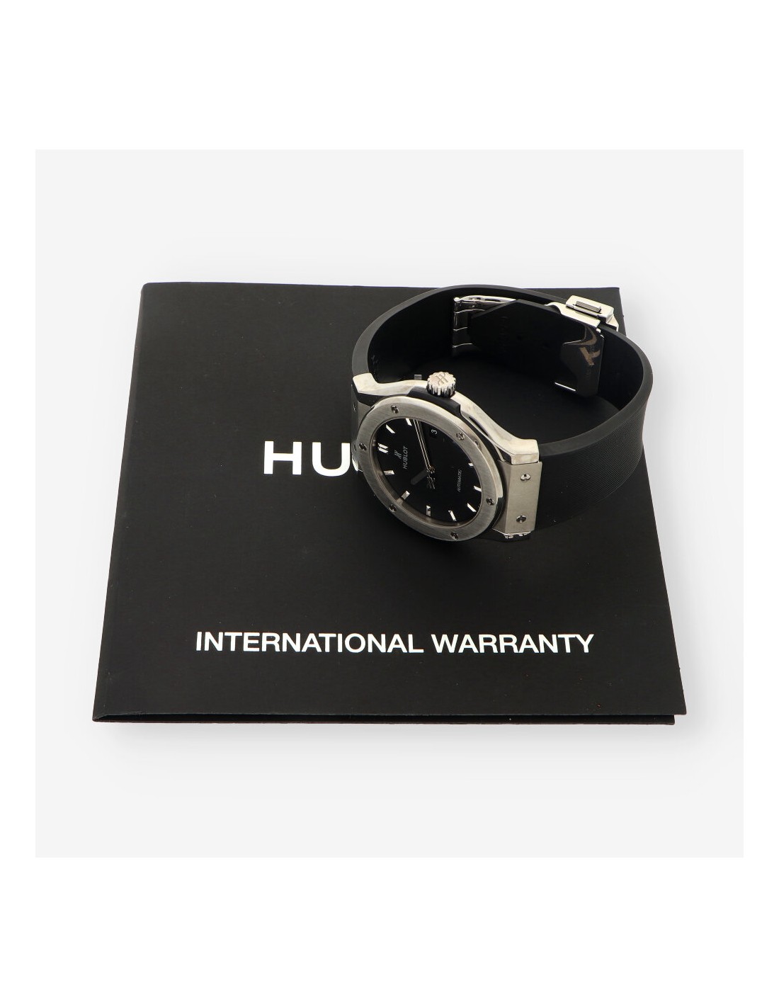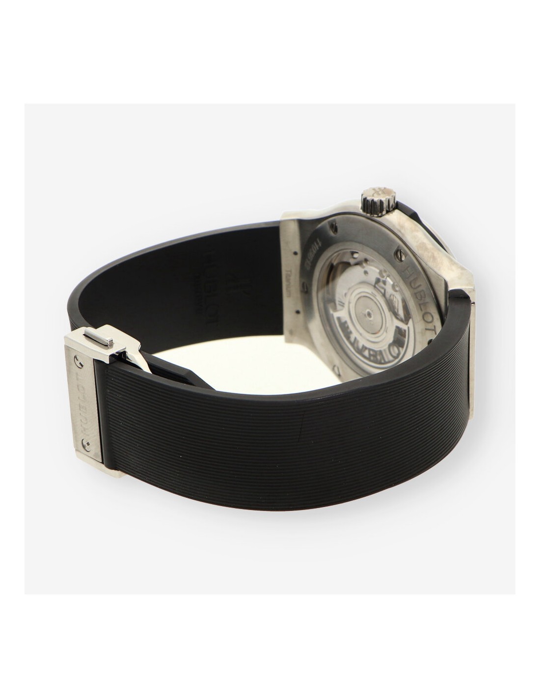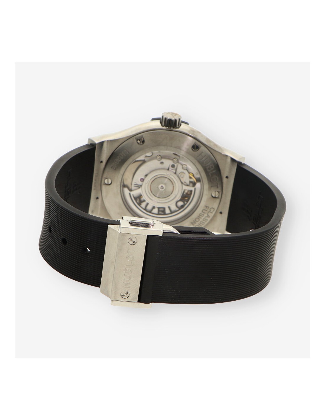 Hublot Clasic Fusion de segunda mano en perfecto estado de marcha y conservación. tamaño 41mm. Caja de acero con fondo atornillado, cristal zafiro. Esfera negra con agujas plateadas, fecha a las 3. Movimiento automático. Pulsera original de caucho negro con cierre desplegable en acero.
