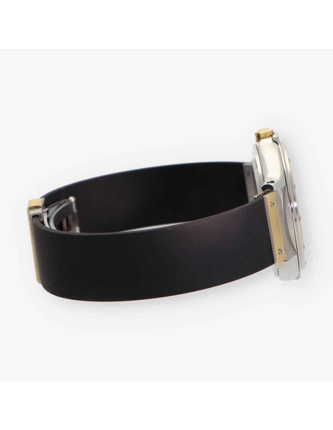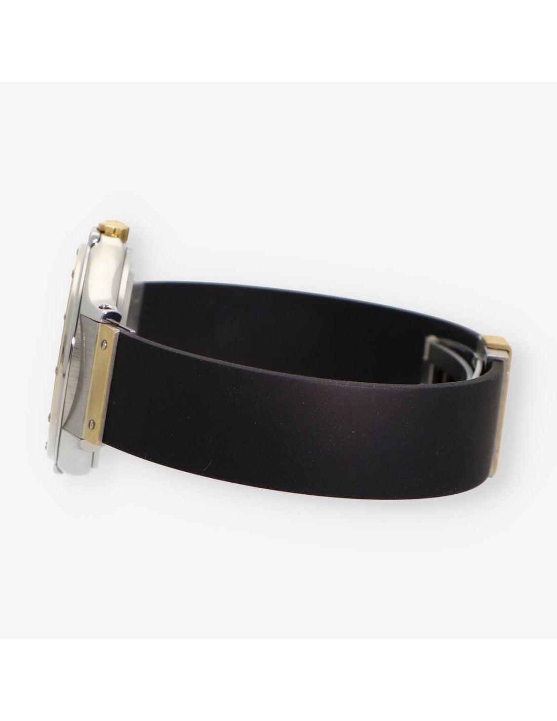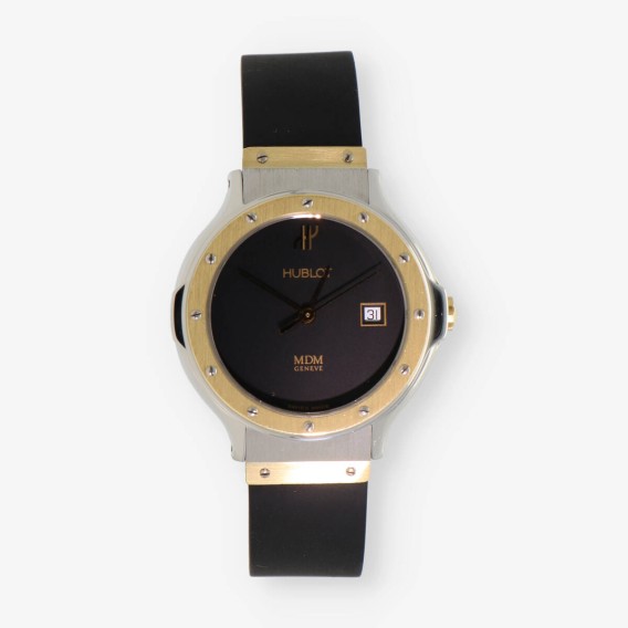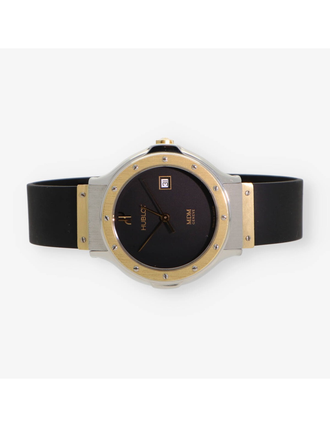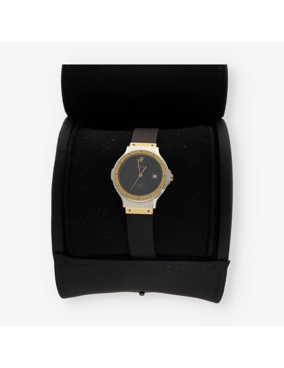 Hublot Clasic de segunda mano en perfecto estado de marcha y conservación. tamaño Lady. Caja de acero y oro con fondo atornillado, cristal zafiro. Esfera negra con agujas plateadas, segundero central, fecha a las 3. Mecanismo de Quartz. Pulsera original de caucho negro con cierre desplegable doble en acero. Diámetro:  28mm.