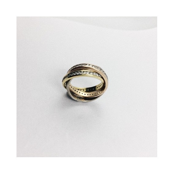 Juego de tres alianzas de brillantes, de segunda mano, en oro blanco, amarillo y rosa de 18 kt., entrelazadas. Talla: 11. Peso: 6,8 g.