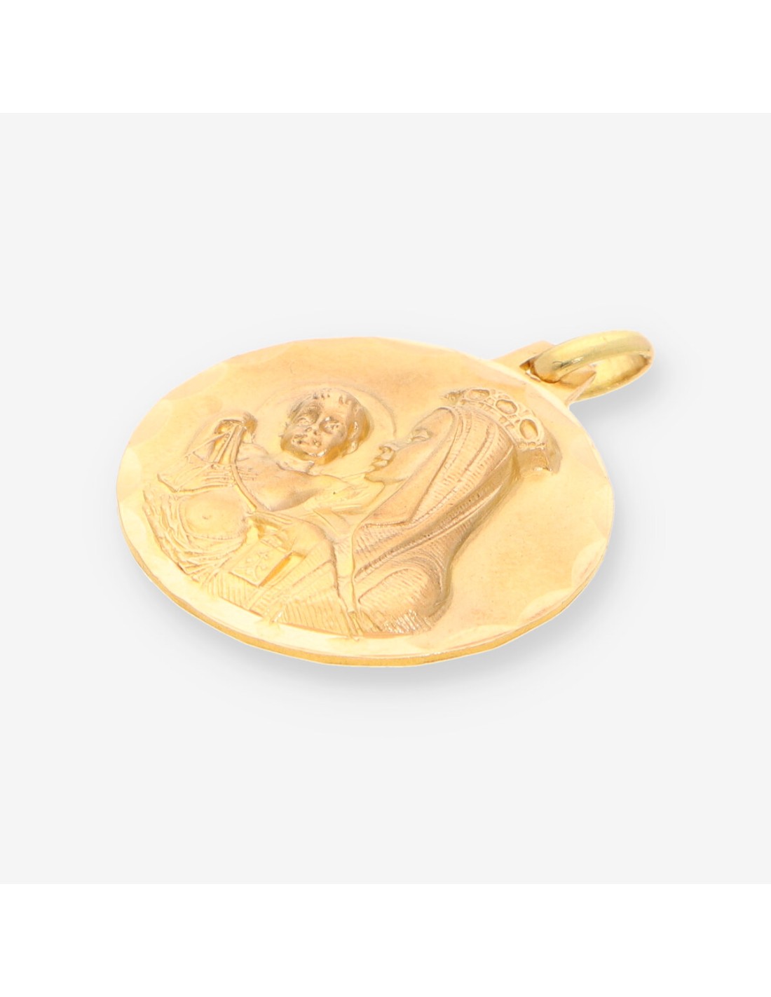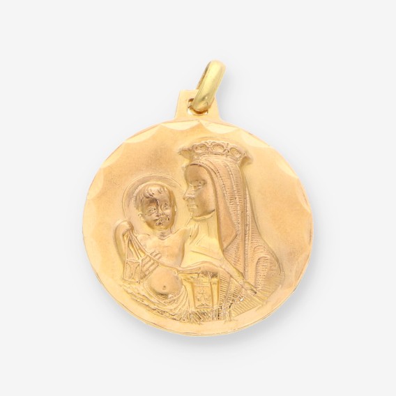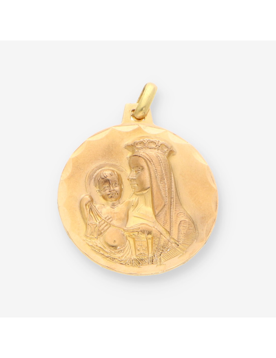 Medalla de segunda mano en oro de primera ley con imagen del cristo por un lado y la virgen con el niño por otro. Peso: 4.1gr. Diámetro: 2.2cm.