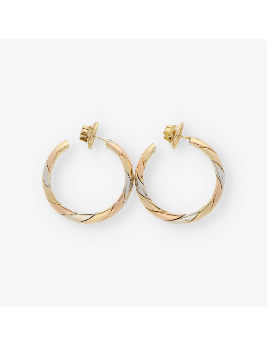 Preciosos pendientes de segunda mano en oro amarillo, rosa y blanco de primera ley en forma de aro con un magnífico acabado. Ideal para cualquier momento. Diámetro: 3.2cm. Grosor: 0.5cm. Peso: 18.5gr.