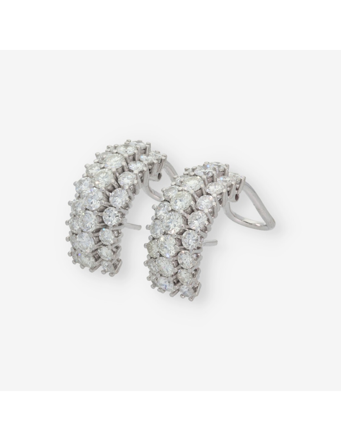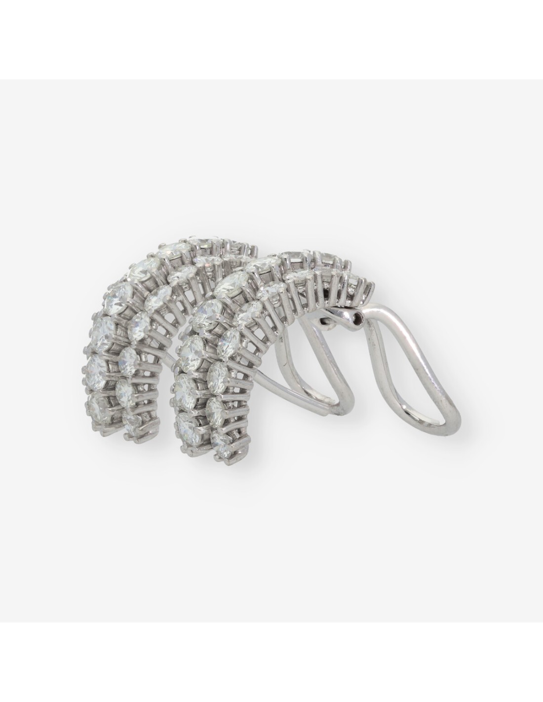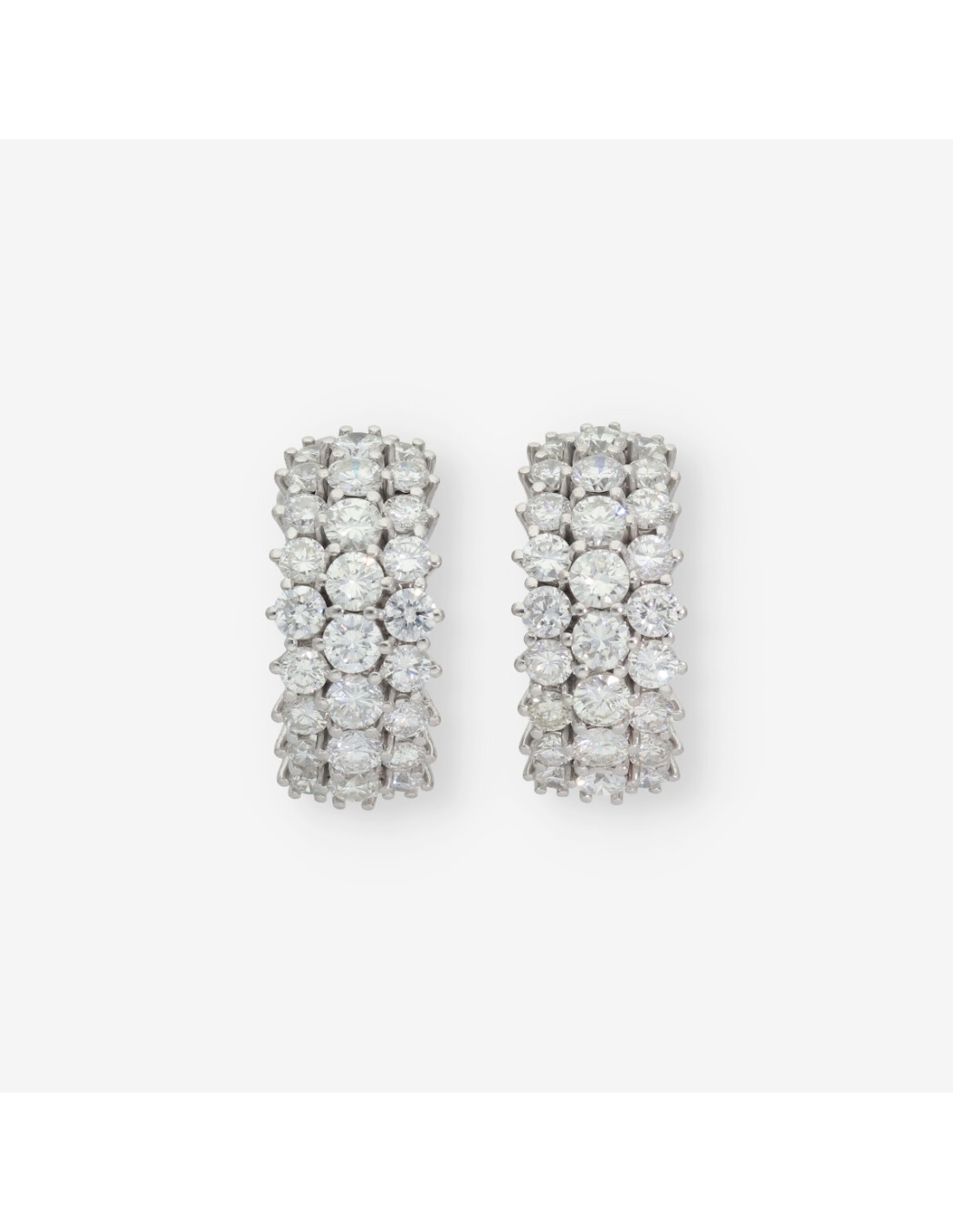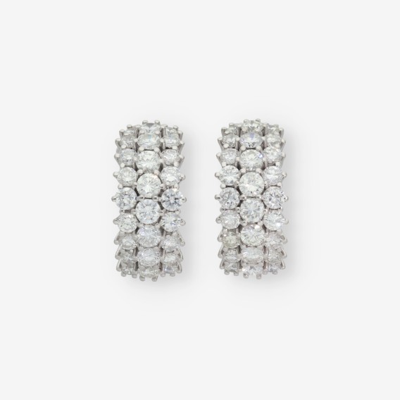 Pendientes de medio aro en oro blanco de primera ley con tres filas de brillantes. Magníficos pendientes con un gran diseño. Ideal para cualquier tipo de eventos. Largo: 2.3cm. Ancho: 1cm. Peso: 13.85gr. Con aproximadamente 4.8 quilates en diamantes.