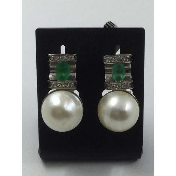Pendientes de ocasión de oro blanco de 18 kt., brillantes, esmeraldas y perla cultivada. Medidas: 2,3 x 1,2 cm. Peso: 8,2 gr.