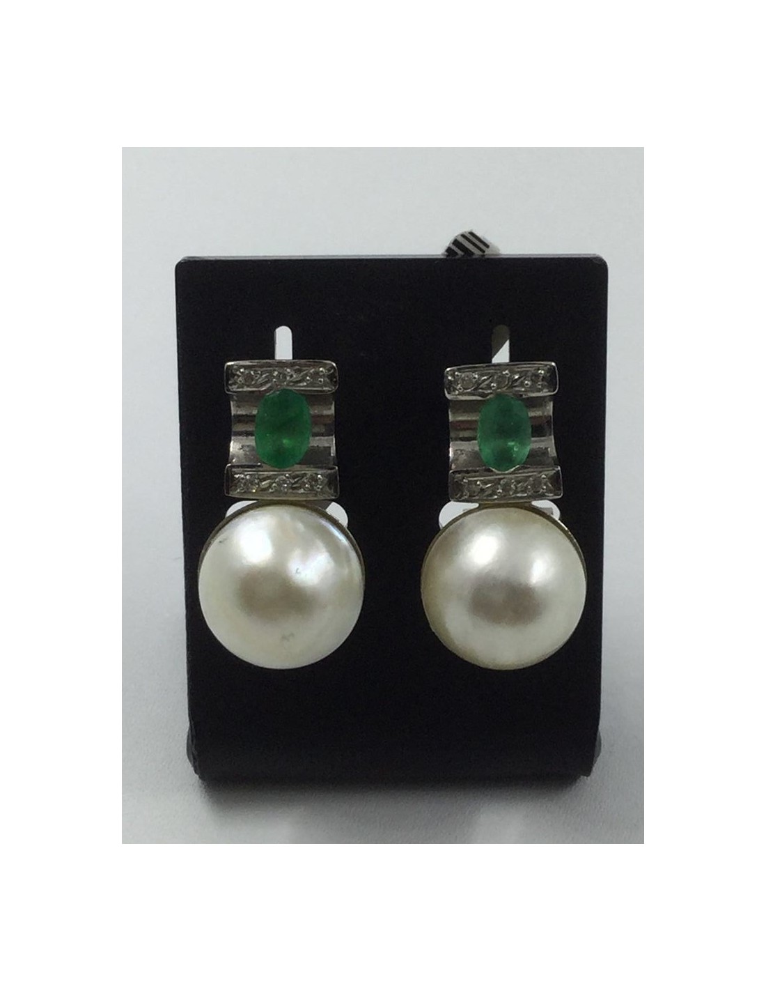 Pendientes de oro blanco, brillantes, esmeraldas y perla