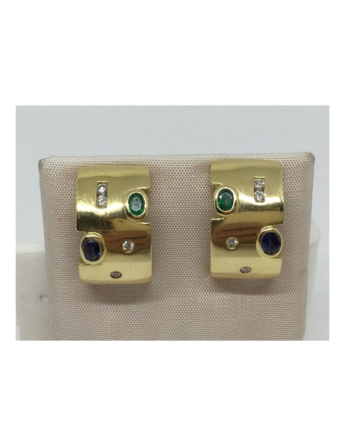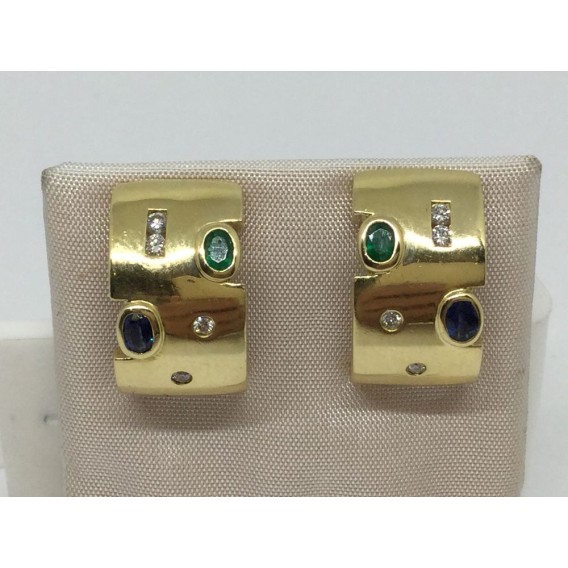 Pendientes de ocasión en oro amarillo de 18 kt. con brillantes, esmeralda y zafiro. Peso: 15 gr.