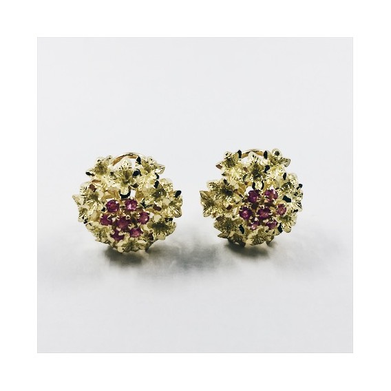 Pendientes de segunda mano en filigrana de oro amarillo de 18 kt. con piedras rosas en el centro. Peso: 11,8 g.