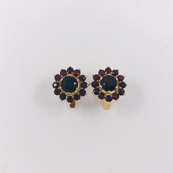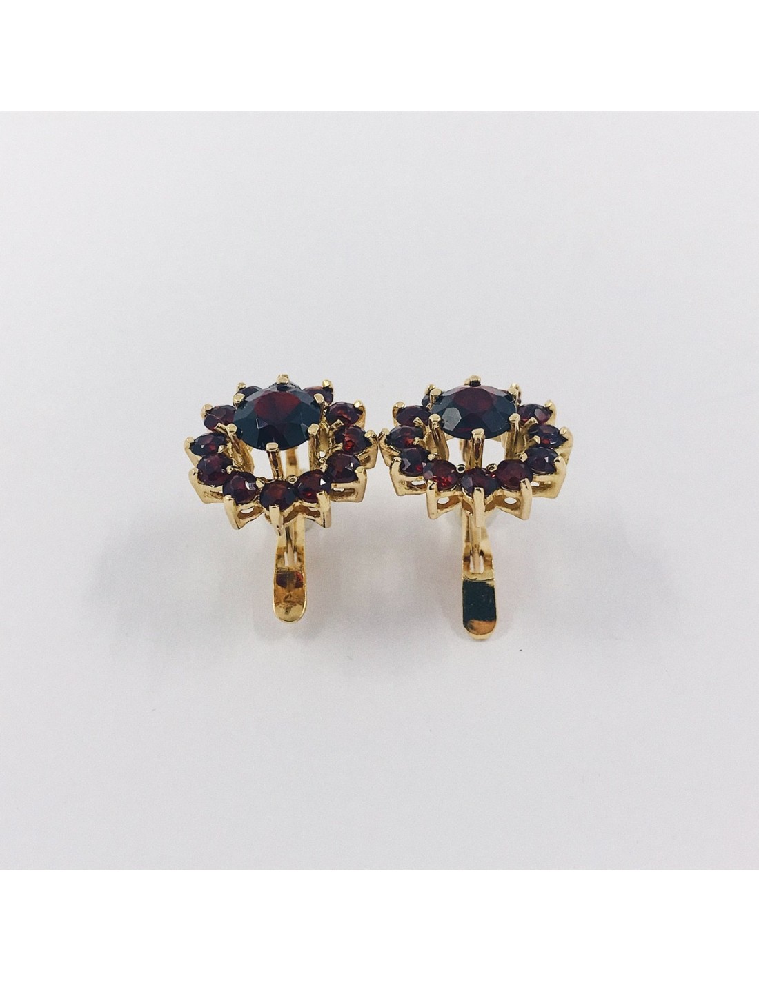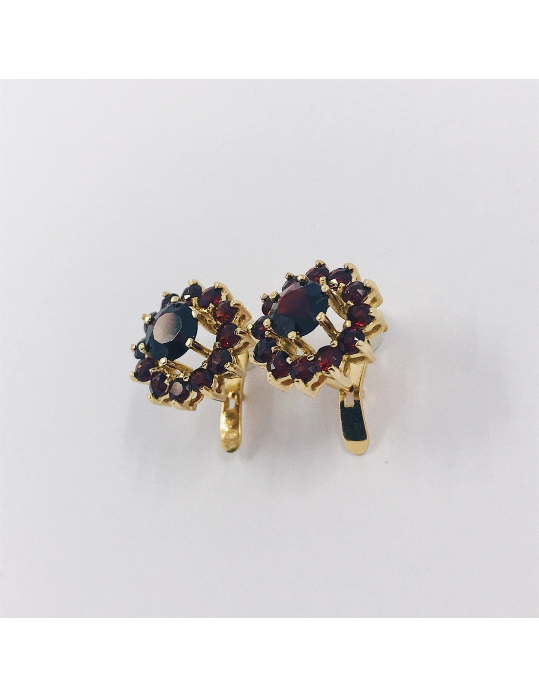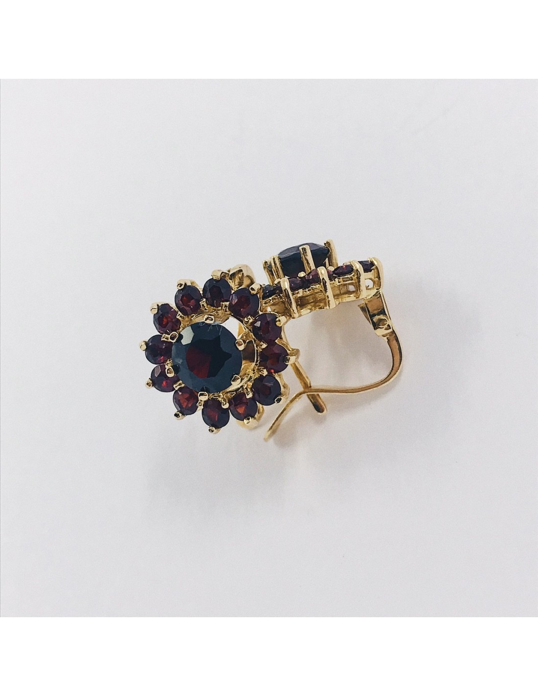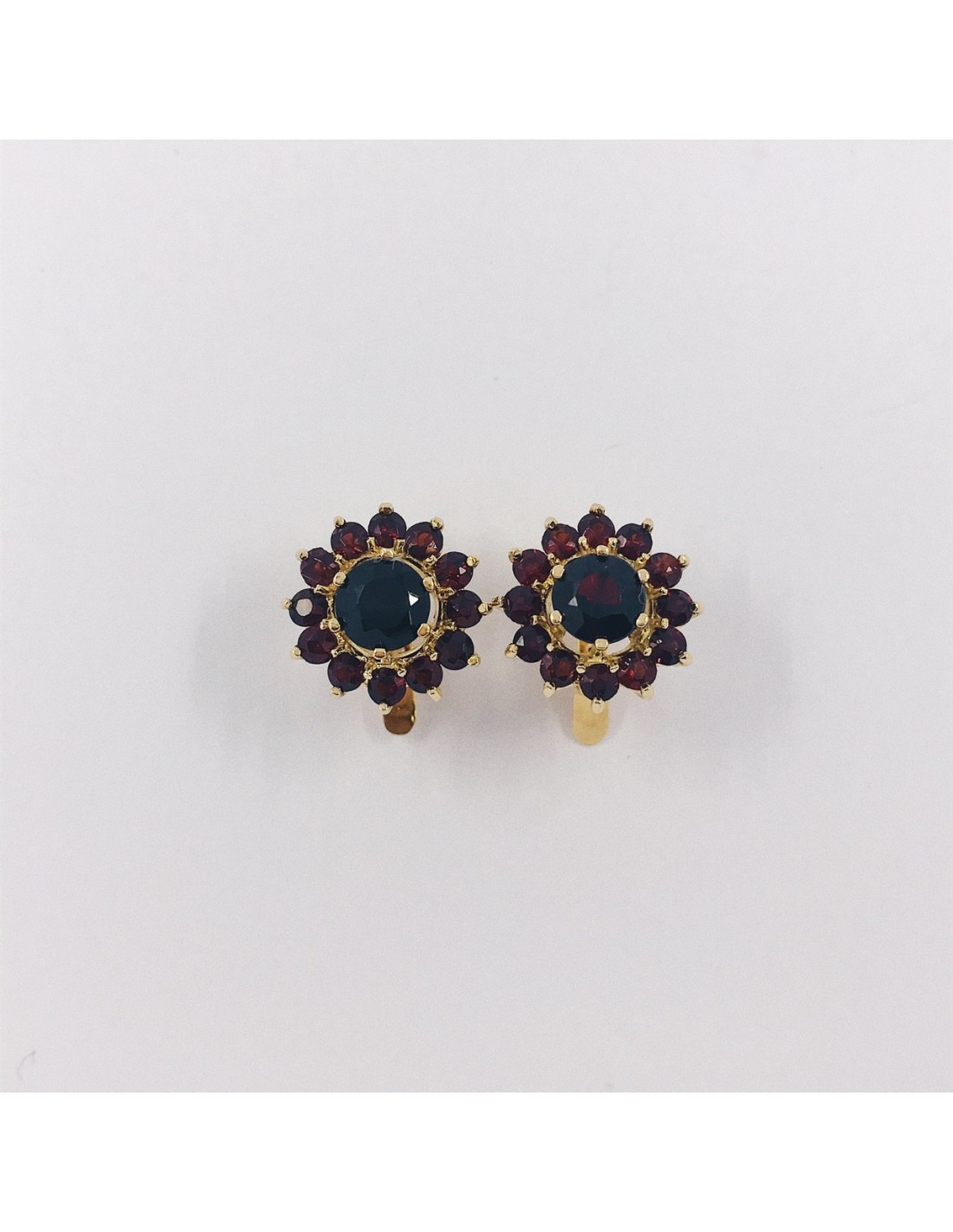 Preciosos pendientes de segunda mano en oro amarillo de primera ley y un magnifico diseño de granate central y a su alrededor con cierre catalana. Una pieza para tenerlo puesto en cualquier momento. Tamaño: 1,2cm. Peso: 5,76gr.