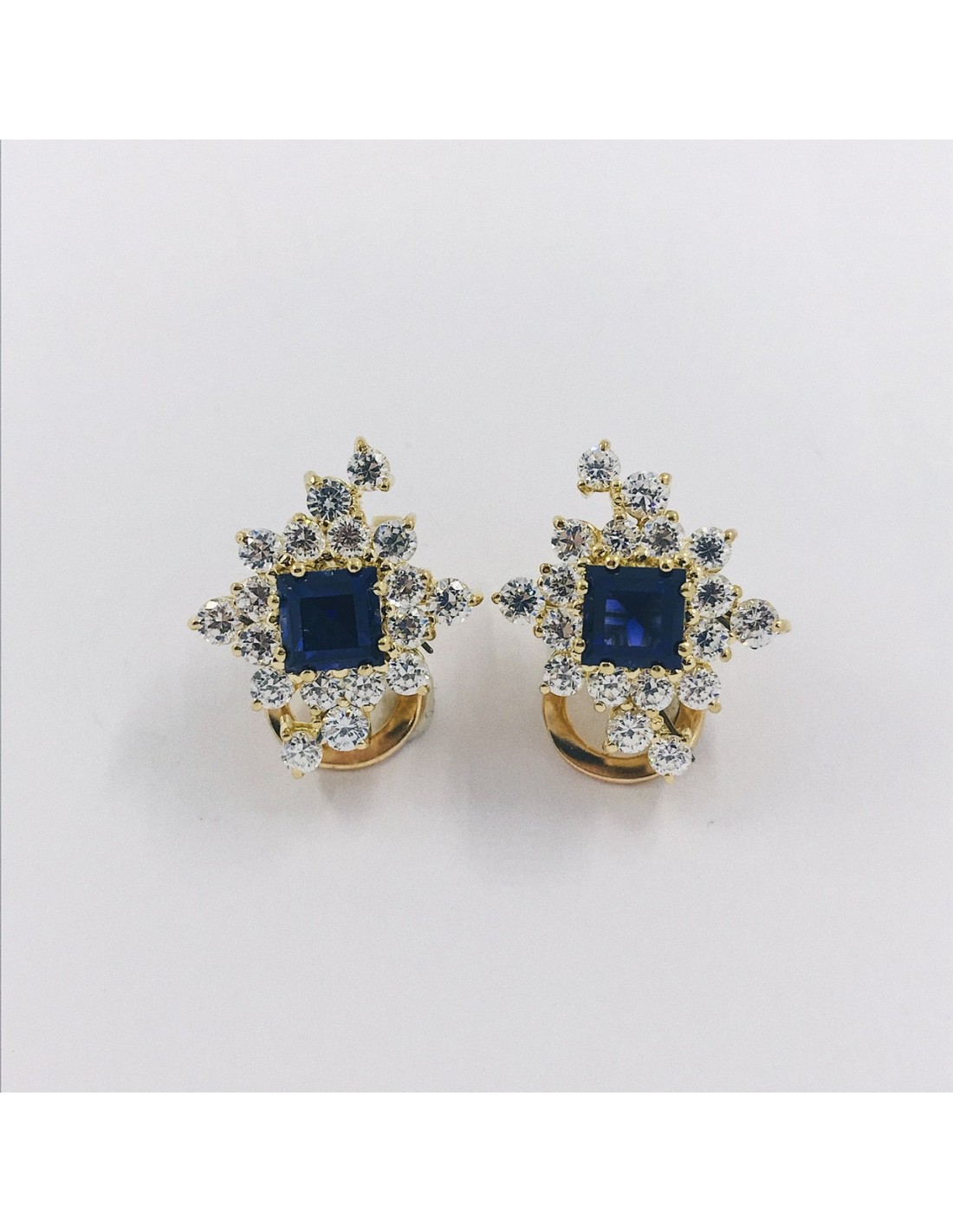 Preciosos pendientes de segunda mano en oro amarillo de primera ley con piedra azul central. Una magnifica pieza para cualquier momento y lugar. Alto: 2,2cm. Ancho: 1,7cm. Peso: 13gr.