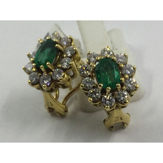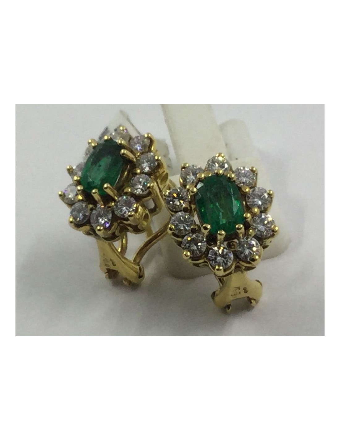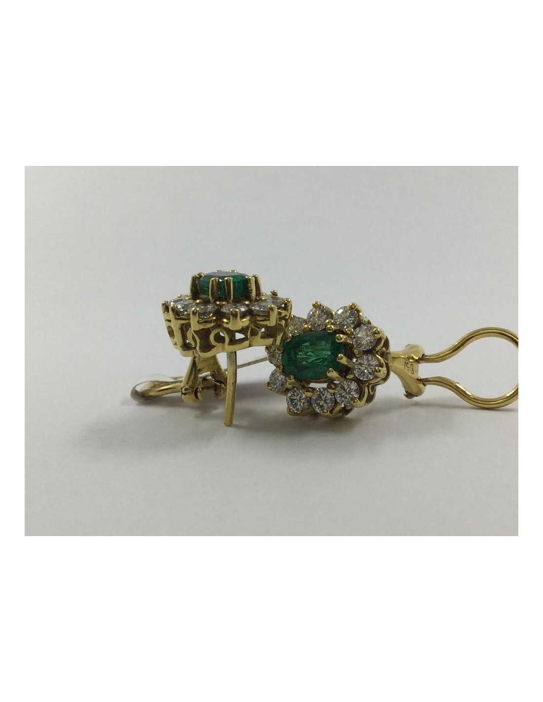 Pendientes rosetón de segunda mano en oro de 18 kt. con brillantes y esmeraldas. Peso aprox. brillantes: 1 qt. Peso: 8,5 gr.