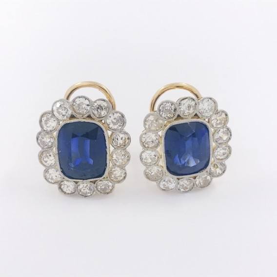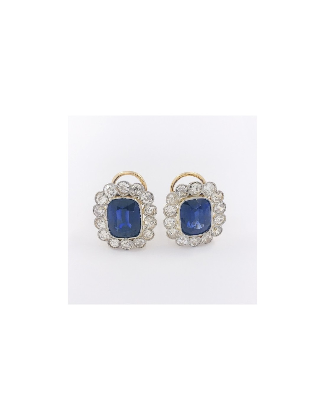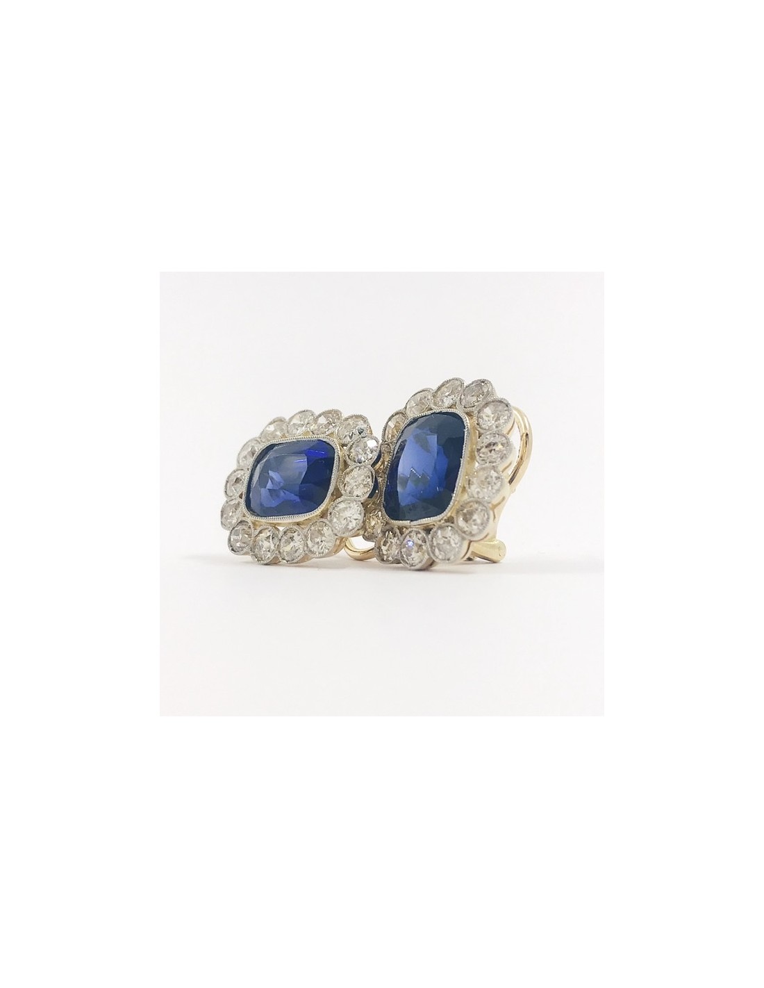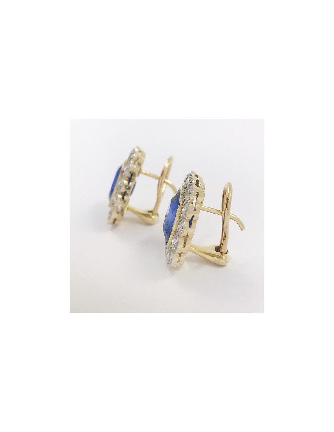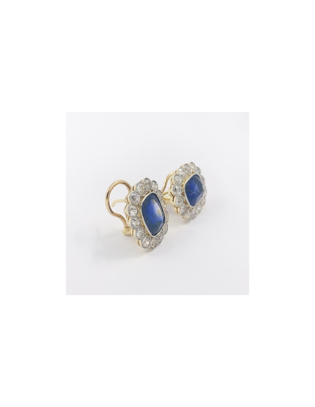 Pendientes rosetón de segunda mano en oro amarillo de 18 kt con frontal de oro blanco con zafiros orlados de brillantes. Peso: 9,9 g.