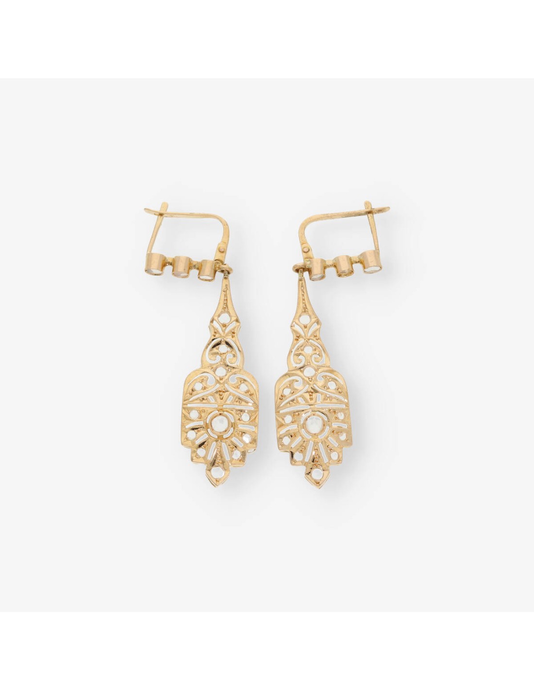 Preciosos pendientes vintage de segunda mano en oro amarillo de primera ley con diamante central. Una magnifica pieza antigua perfectamente conservado. Cierre catalán. Alto: 3.7cm. Ancho: 1cm. Peso: 3.64gr.