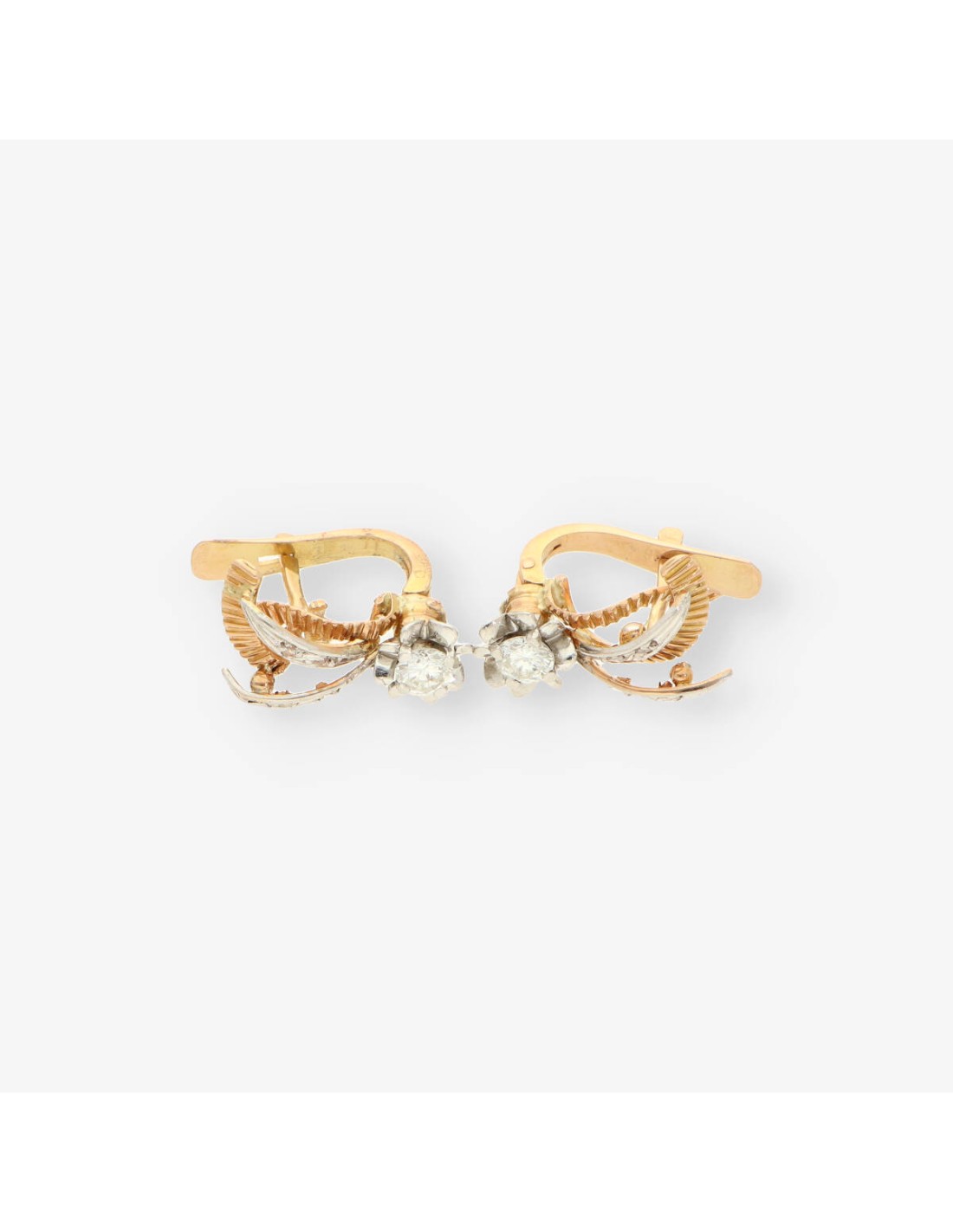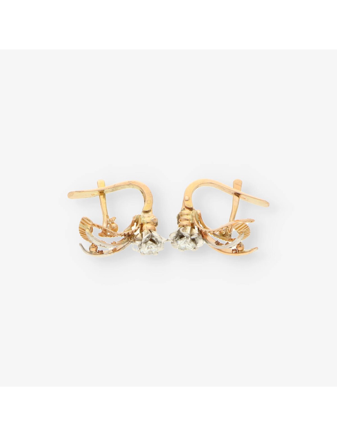 Preciosos pendientes vintage de segunda mano en oro amarillo de primera ley con diamante central. Una magnifica pieza antigua perfectamente conservado. Cierre catalán. Alto: 1.8cm. Ancho: 1.1cm. Peso: 6.7gr