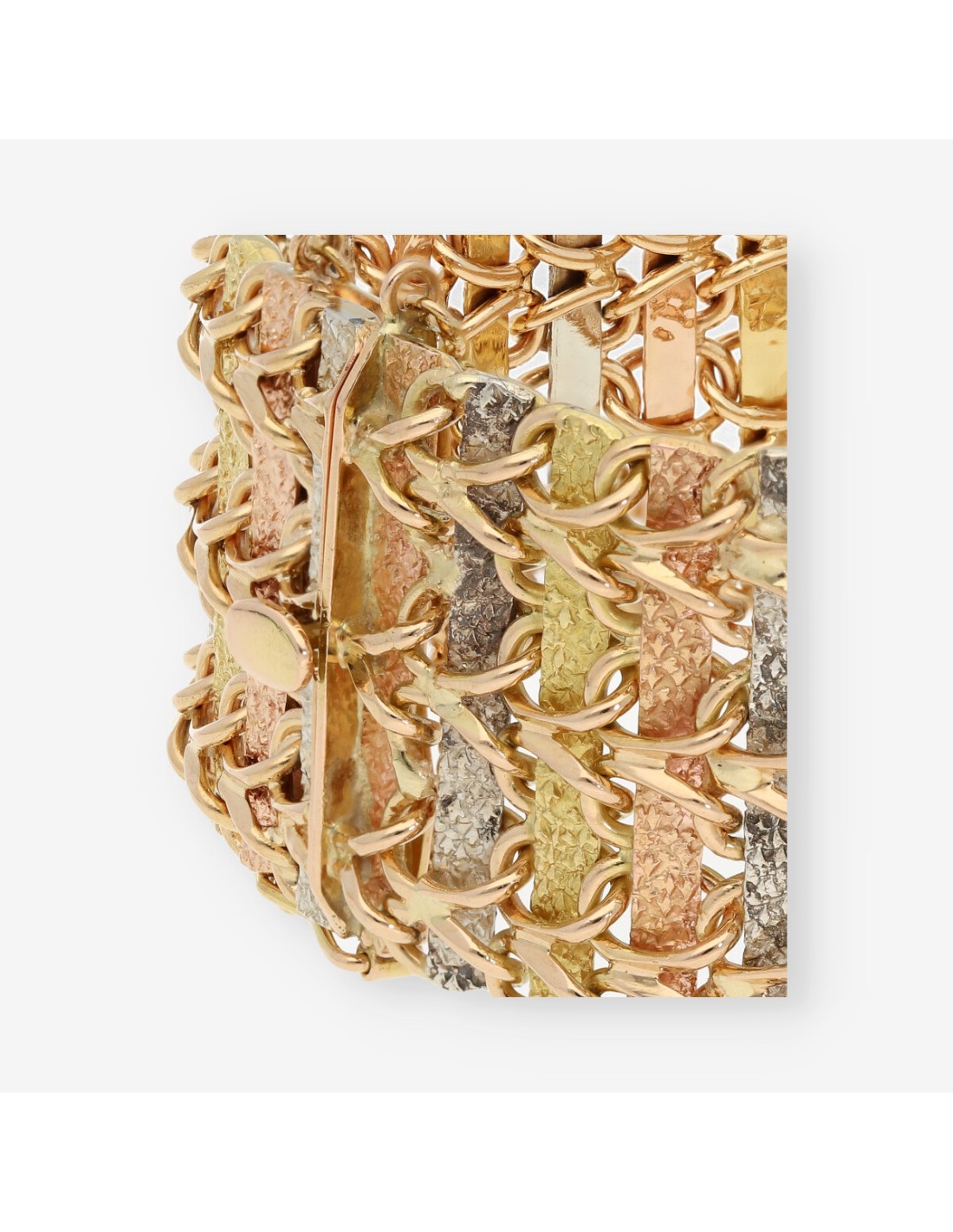 Pulsera ancha de ocasión en oro blanco, amarillo y rosa de primera ley. Una pieza espectacular con un magnífico trabajo y acabado  Longitud: 21cm. Ancho: 2.9cm. Peso: 80.42gr.