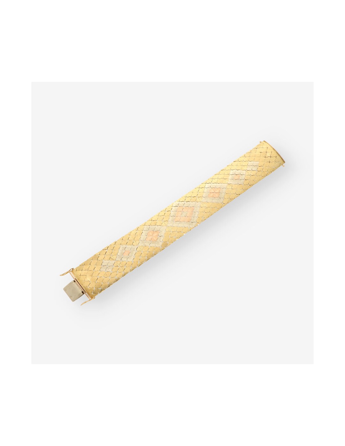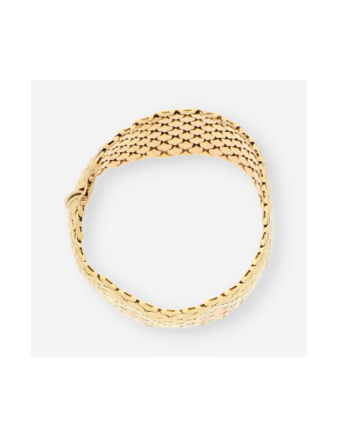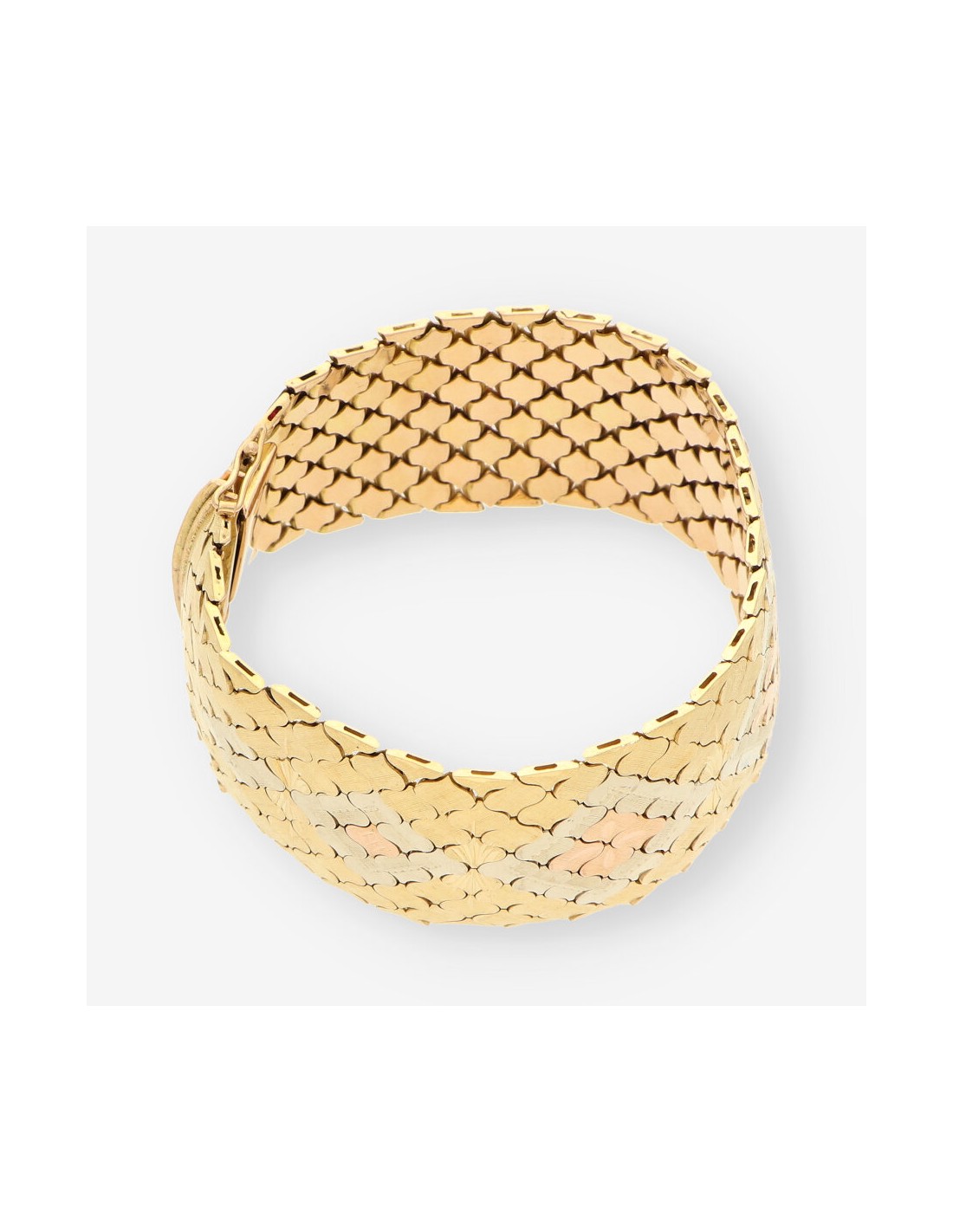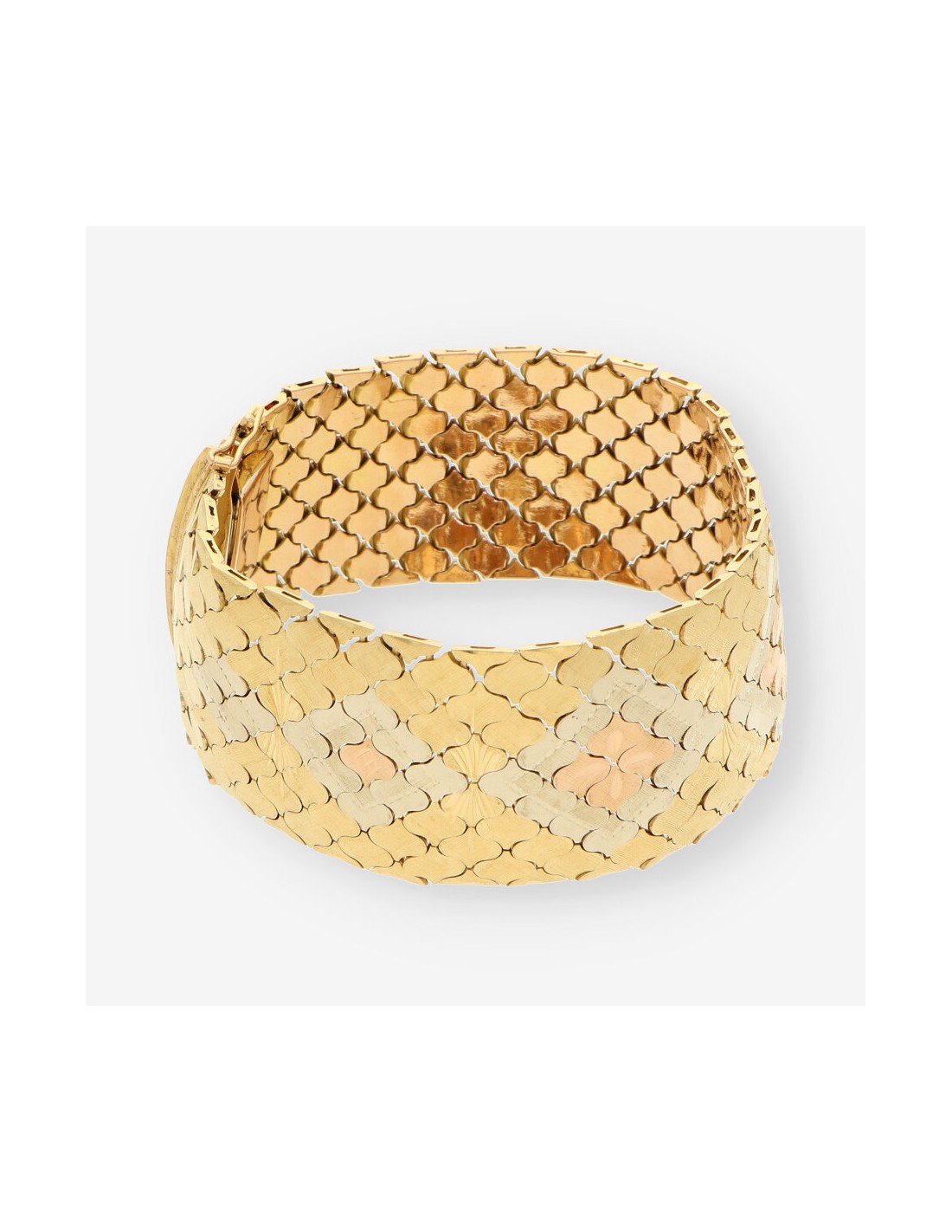 Pulsera ancha en oro amarillo de 18 quilates, una joya excepcional que combina diseño y presencia. Esta pieza de segunda mano cuenta con un largo de 21,5 cm y un impresionante ancho de 2,9 cm, con un peso total de 85,2 gramos. Su acabado texturizado y diseño único hacen de esta pulsera una elección deslumbrante para lucir en ocasiones especiales.
