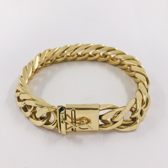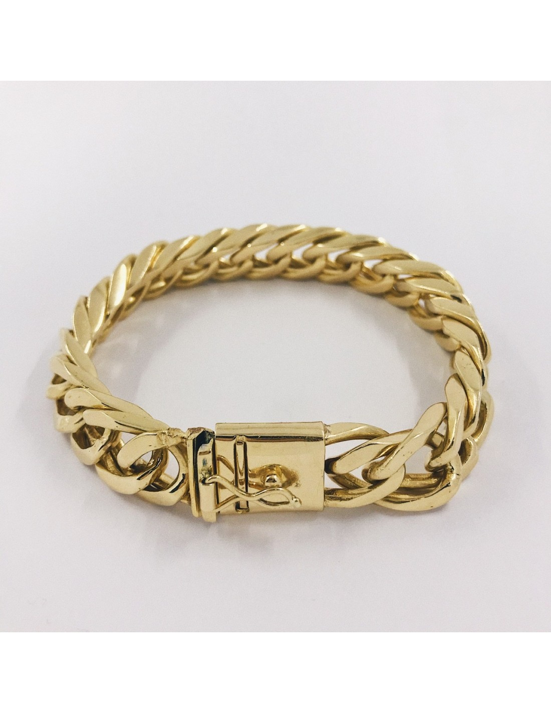 Magnifica pulsera barbada de segunda mano en oro amarillo de primera ley. Con un diseño clásico y tradicional hacen de esta pieza ideal para los amantes de pulseras. Largo: 21cm. Peso: 90,2gr.