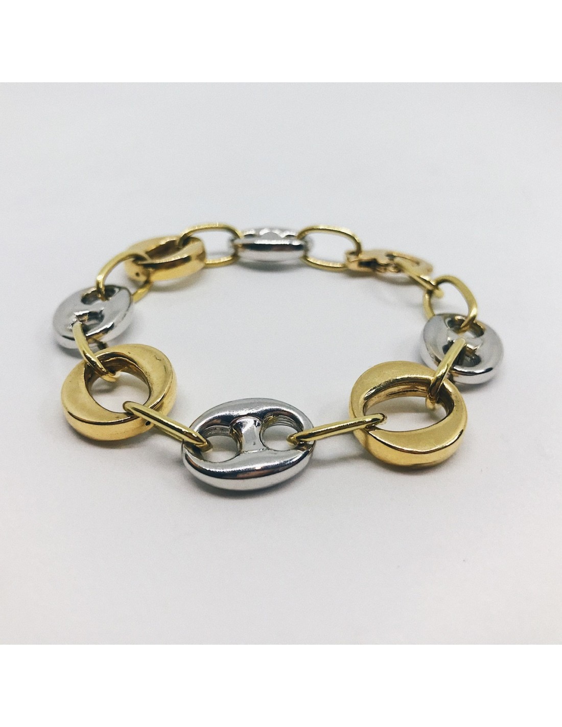 Preciosa pulsera bicolor de segunda mano en oro amarillo y blanco de primera ley con una perfecta combinación de tres tipos diferentes  de eslabones con cierre de mosquetón. Longitud: 20cm. Peso:18,4gr