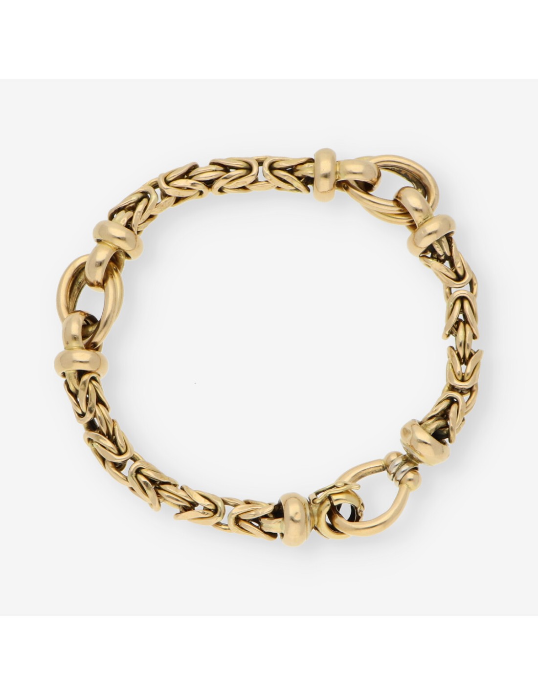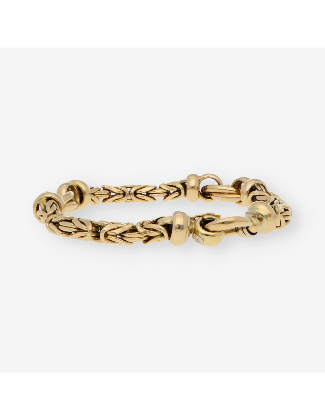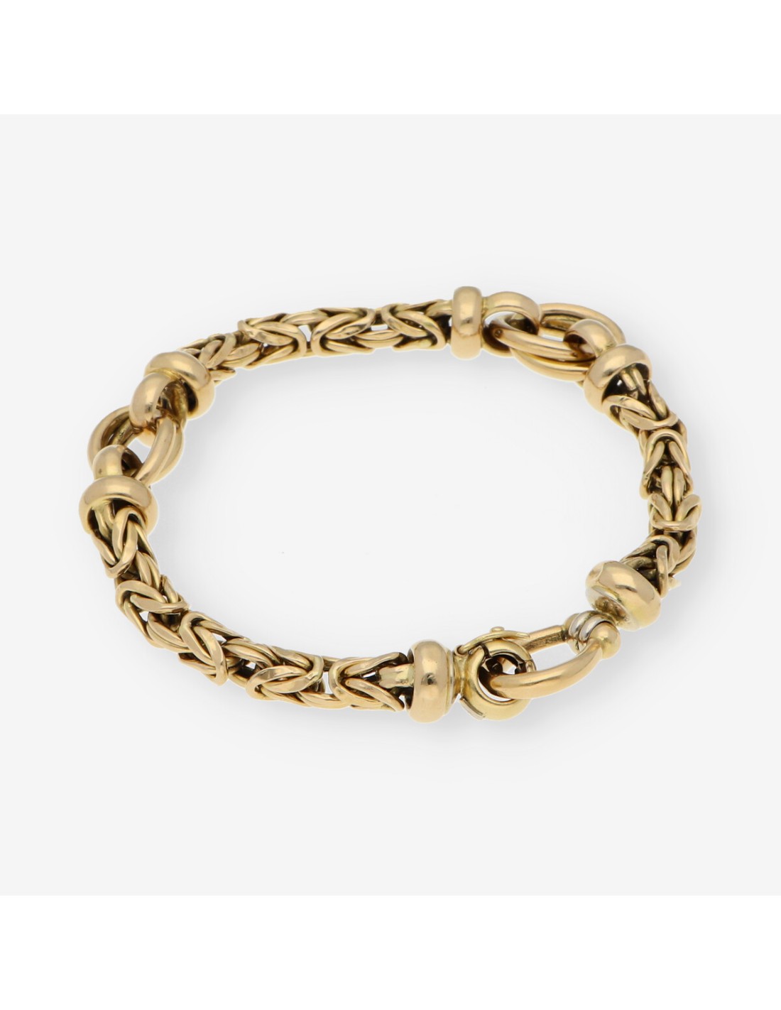 Preciosa pulsera de segunda mano en oro de primera ley con eslabones de espiga. Una pieza clásica y elegante, ideal para los amantes de pulseras. Longitud: 22cm. Grosor: 0.5cm. Peso: 22.8gr.