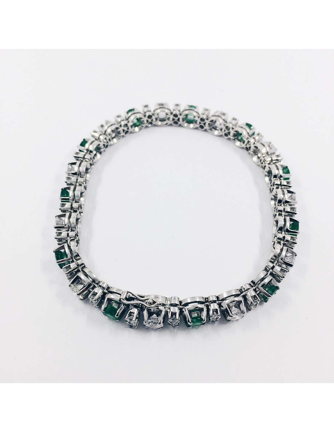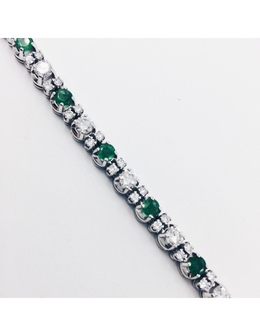 Pulsera de segunda mano en oro blanco de 18 kt. con esmeraldas y brillantes alternados. Longitud: 18,2 cm. Peso: 22,9 g.