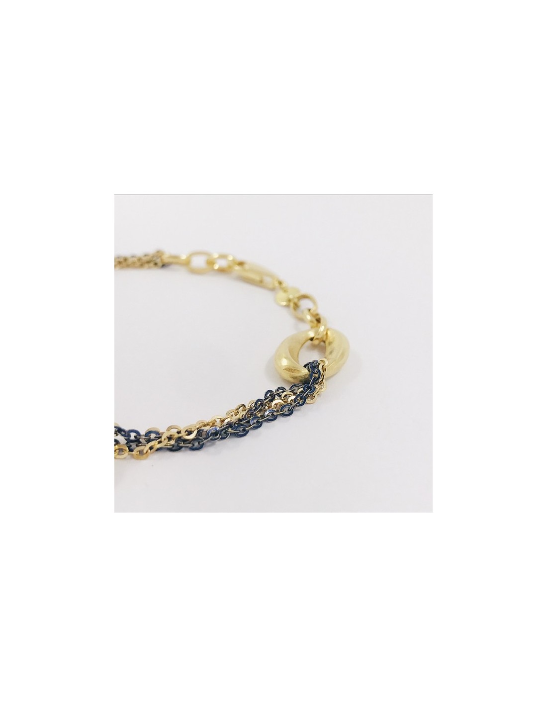 Magnifica pulsera de segunda mano en oro bicolor de primera ley con 3 eslabones y cierre de mosquetón, ideal para cualquier momento. Longitud: 18.5cm. Peso: 7.5gr.