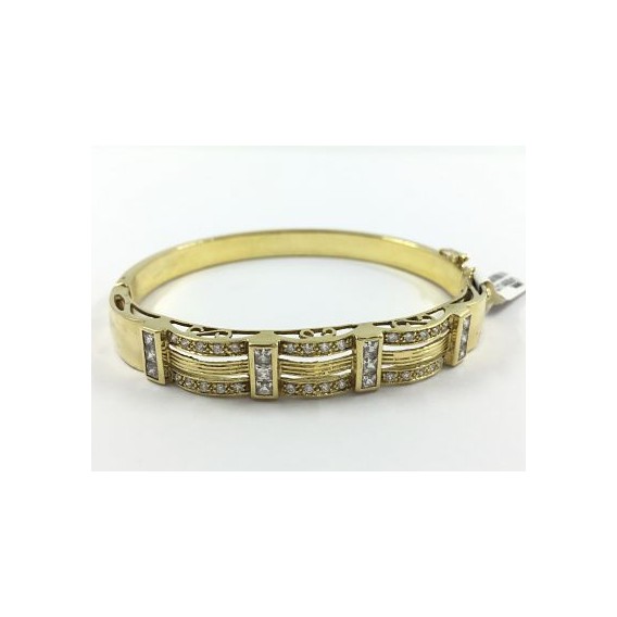 Pulsera esclava de segunda mano en oro amarillo de 18 kt. y centro de circonitas. Peso: 19,5 gr. Diámetro: 6,4 cm.
