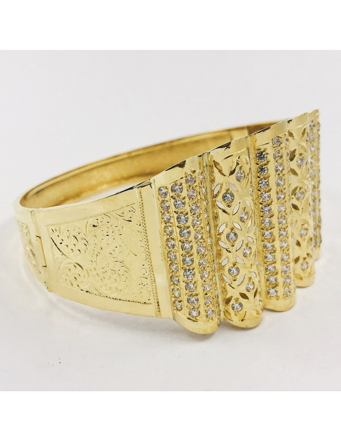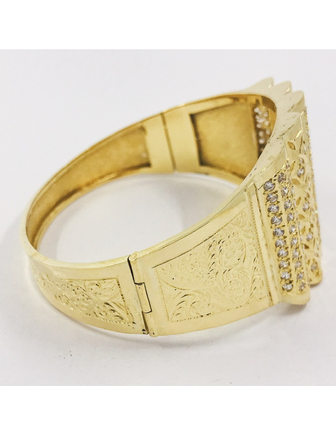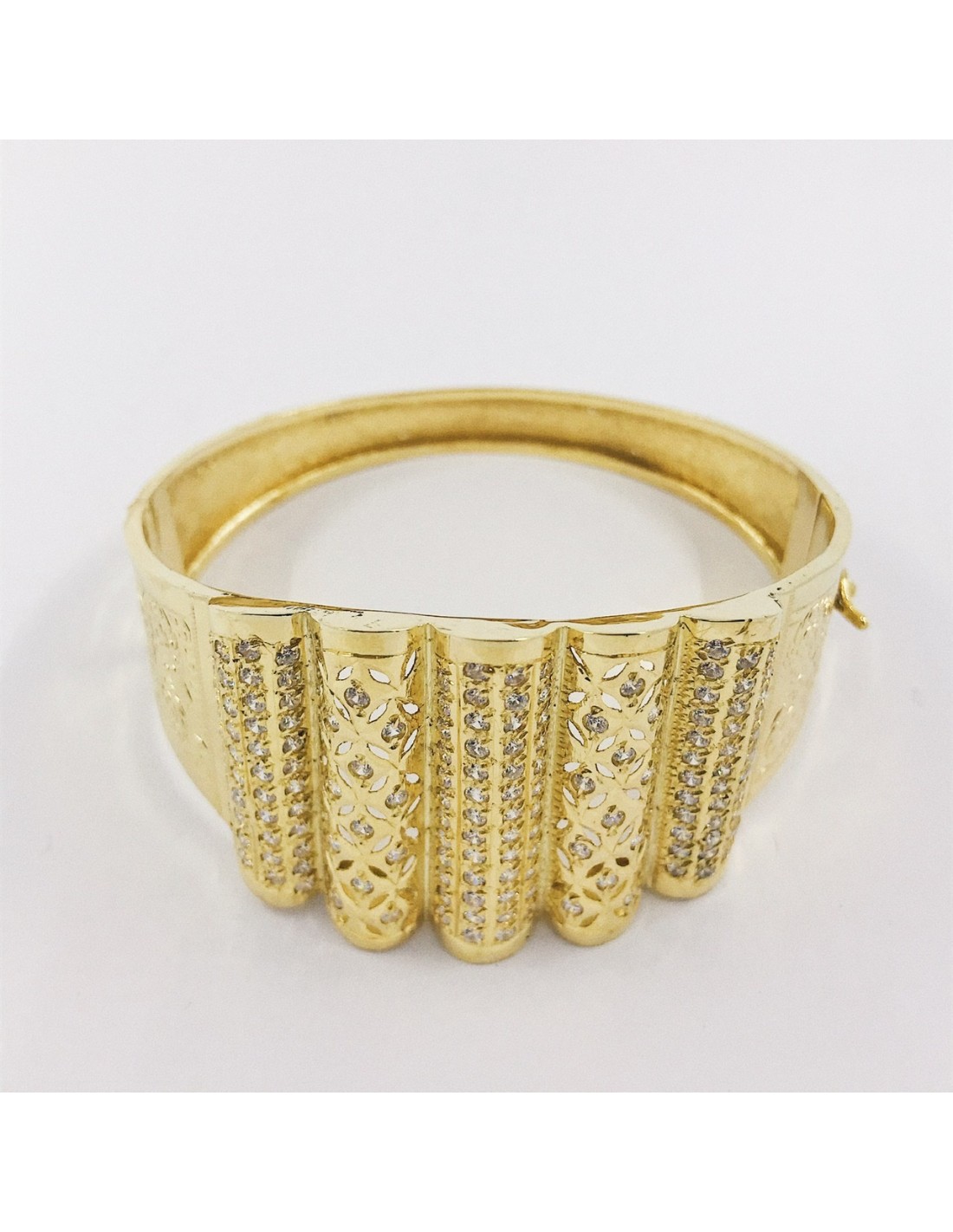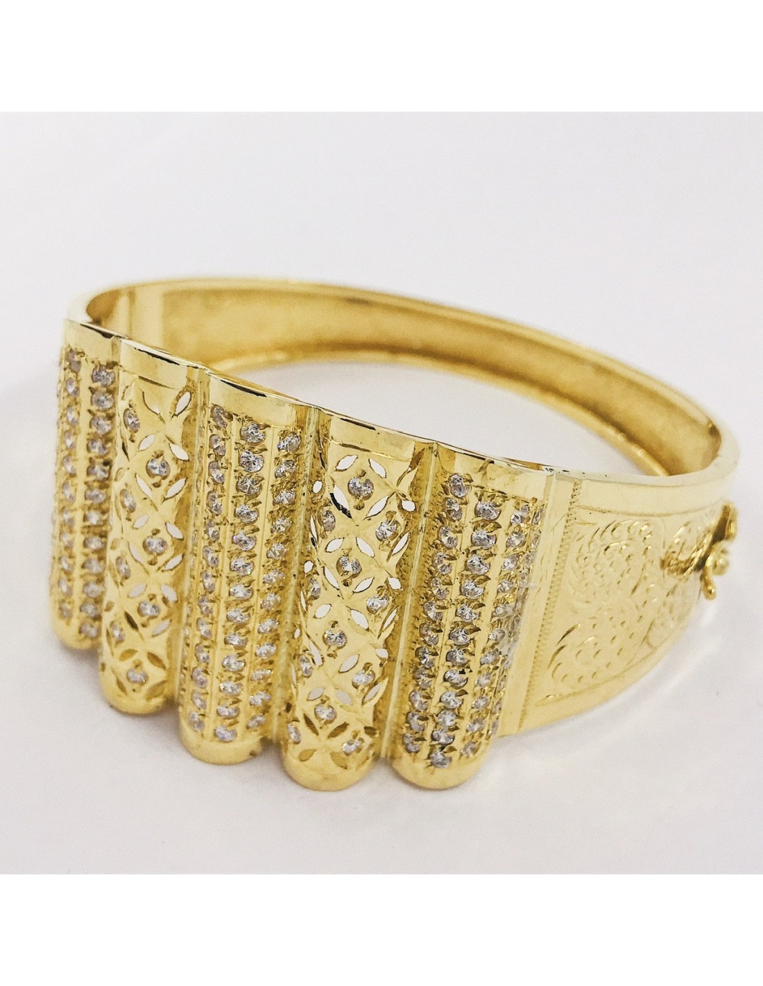 Magnifica pulsera de segunda mano en oro amarillo de primera ley. Una preciosa pulsera esclava ancha ideal para cualquier momento. Diámetro: 6,2cm. Peso: 22,28gr.