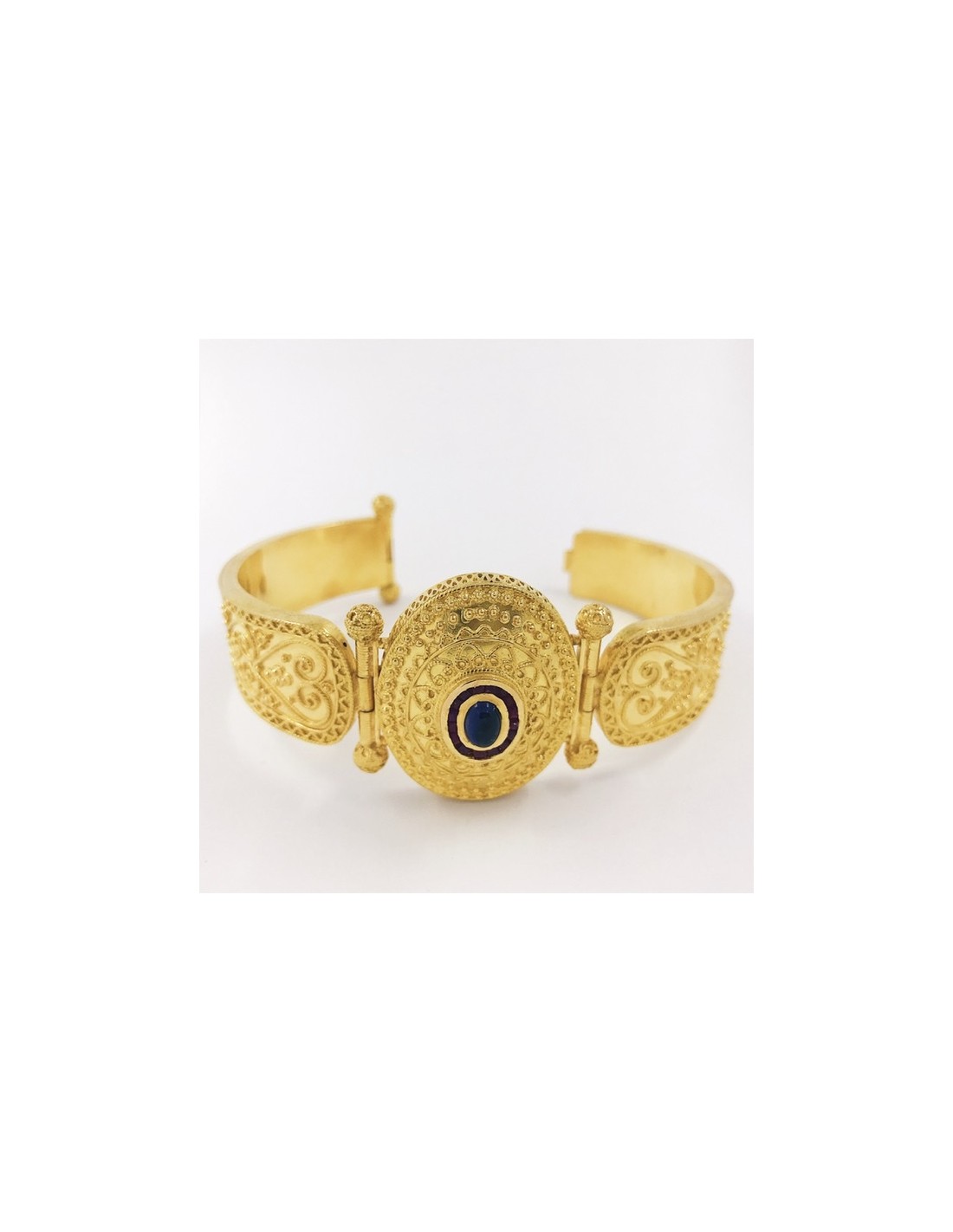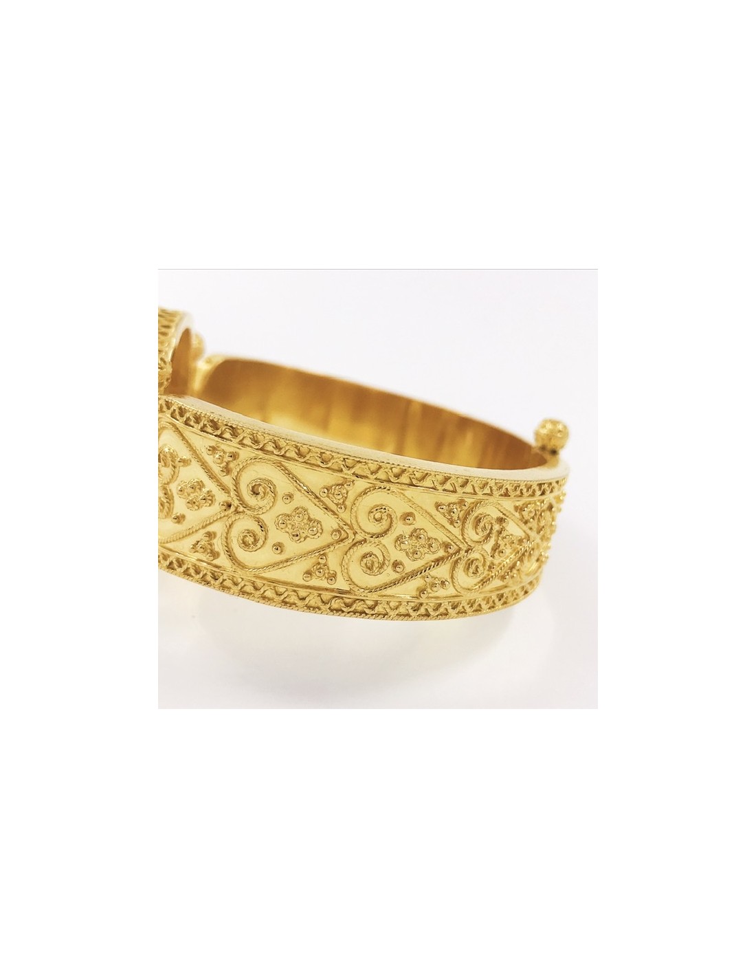 Magnifica pulsera de segunda mano en oro amarillo de primera ley en 22kt. Una preciosa pieza con gravados muy elavorados. Diámetro: 6cm. Peso: 66.7gr.
