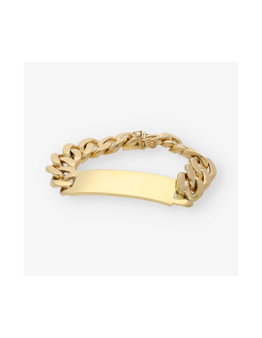 Preciosa pulsera nomeolvides de segunda mano para caballero en oro de primera ley con eslabones barbadas. Una pieza clásica y elegante, ideal para los amantes de pulseras. Longitud: 22cm. Grosor: 1.6cm. Ancho de la placa: 1.7cm. Peso: 128.85gr.