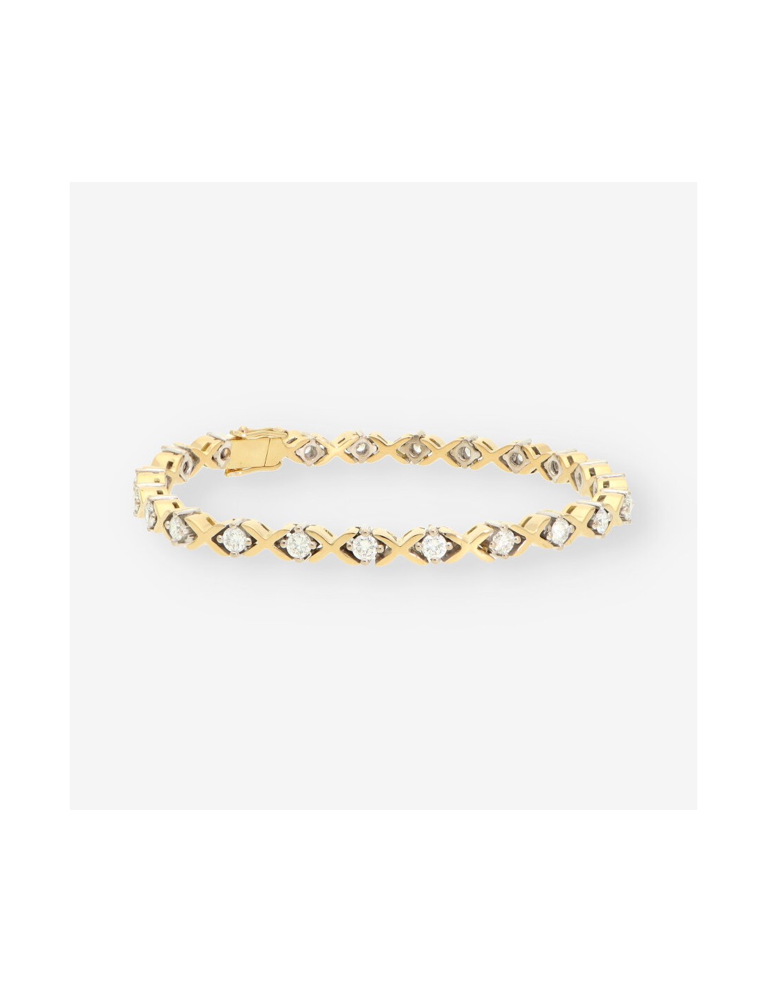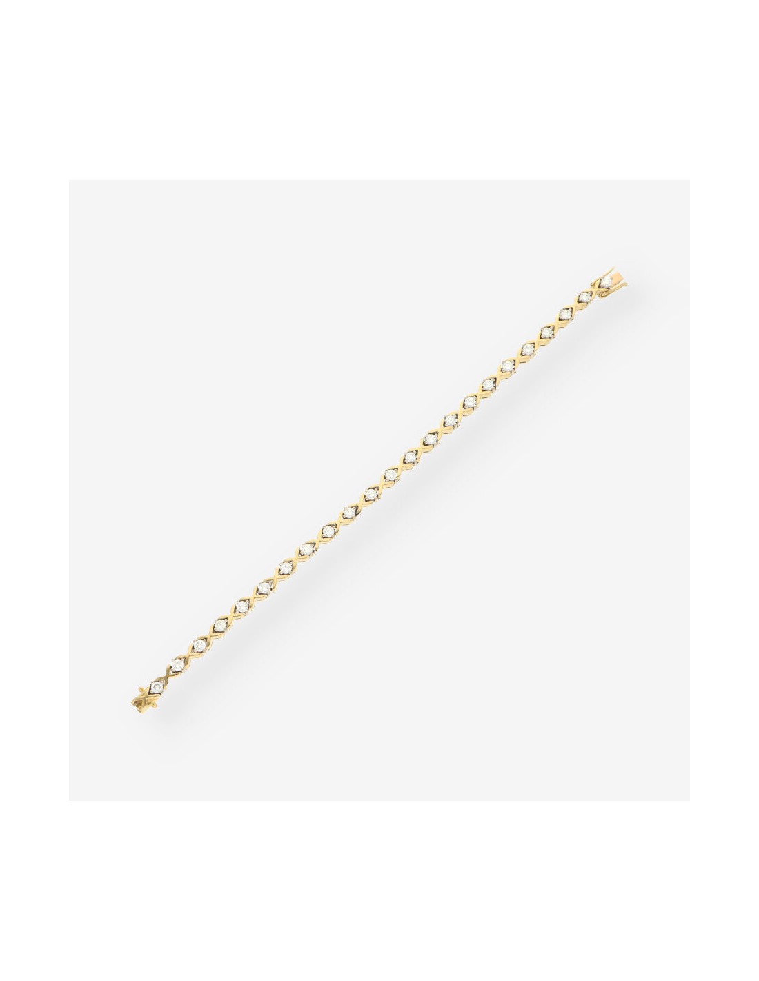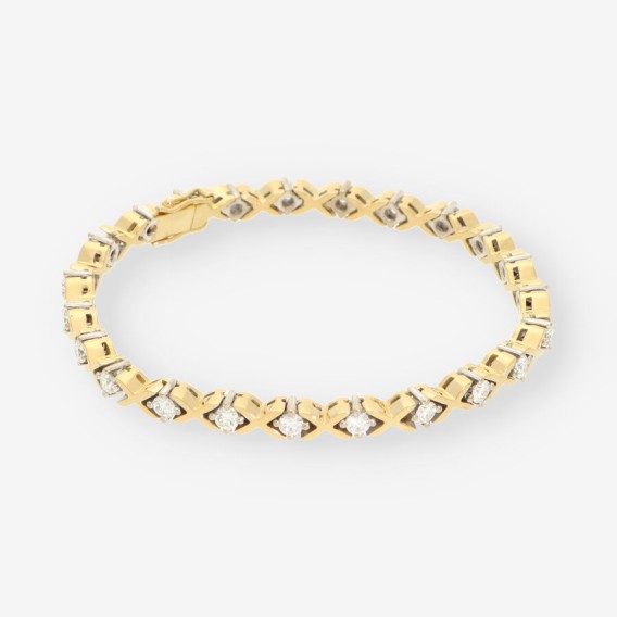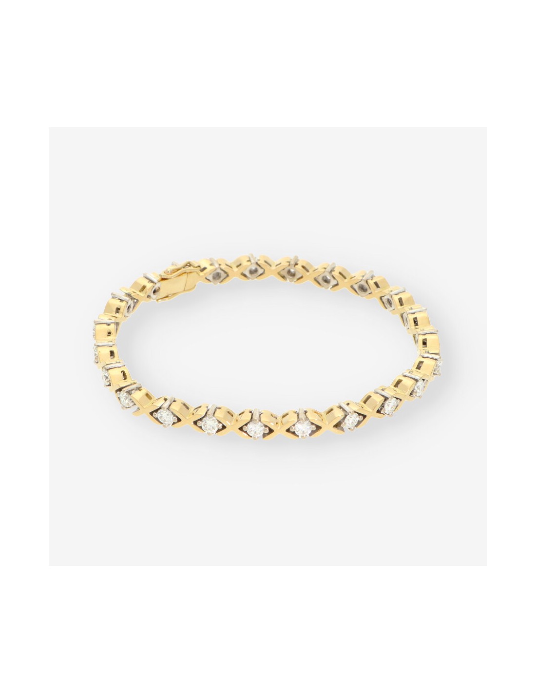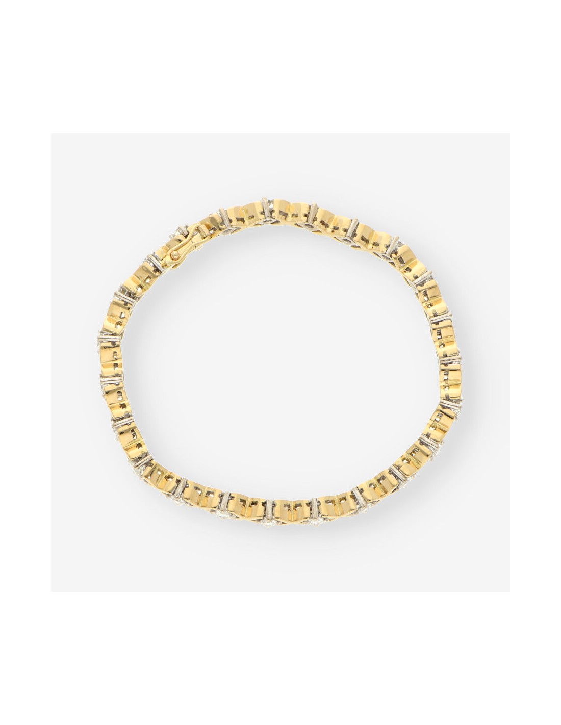 La pulsera está elaborada en oro de primera ley, con un diseño delicado que incluye brillantes como piedra central en cada enlace. Esta pieza es de segunda mano, con una longitud de 18.5 cm y un peso total de 23.95 gramos. Su elegante disposición de esmeraldas realza la belleza del oro amarillo, haciéndola una joya ideal para aquellos que buscan una pieza sofisticada y con carácter.
