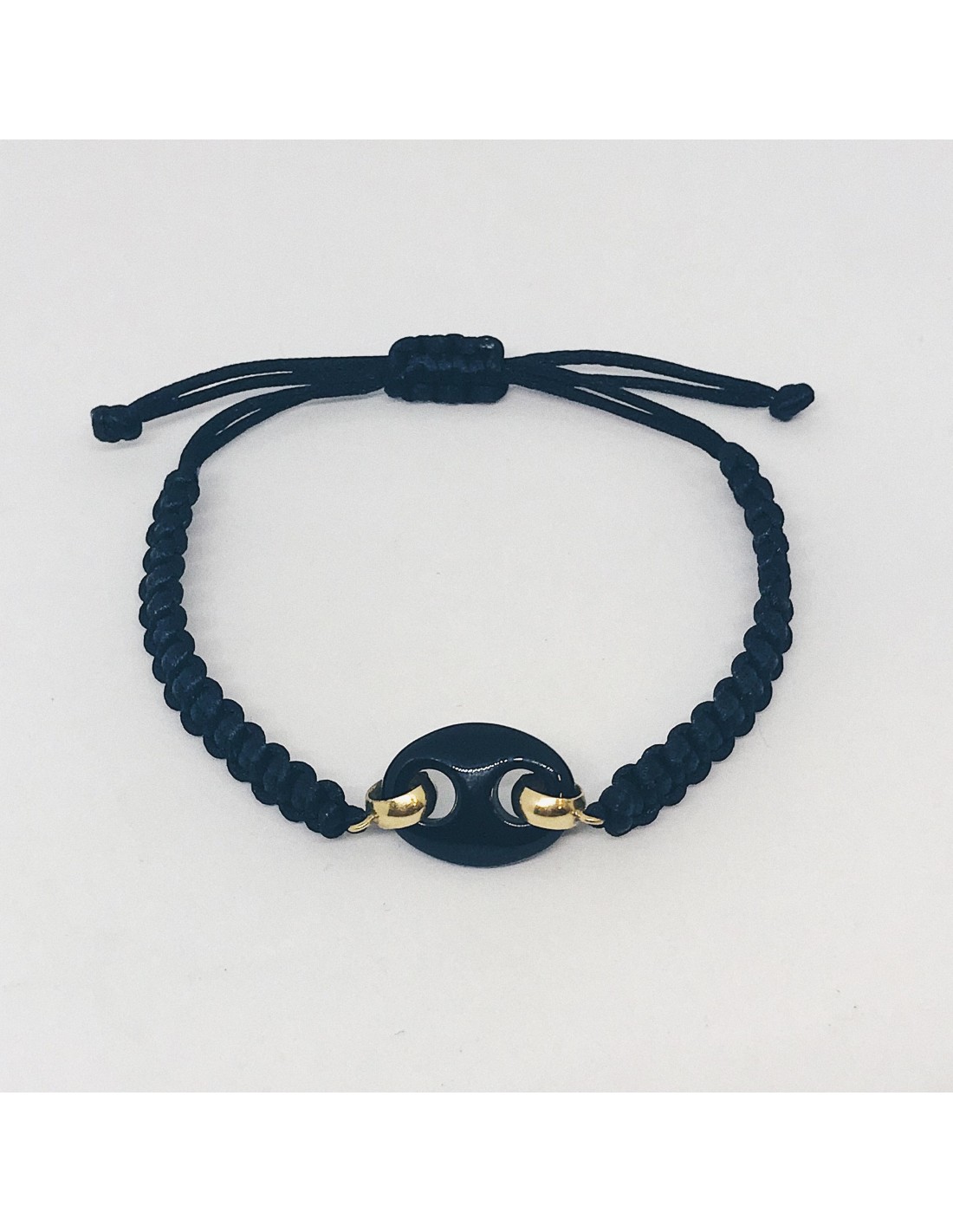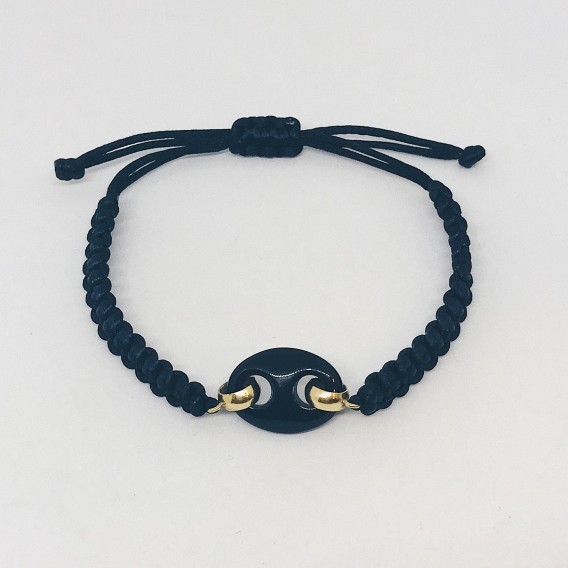 Pulsera de segunda mano en oro 18kt y cordón trenzado en negro con una porcelana ovalada también en negro. Un diseño simple, sencillo y precioso.