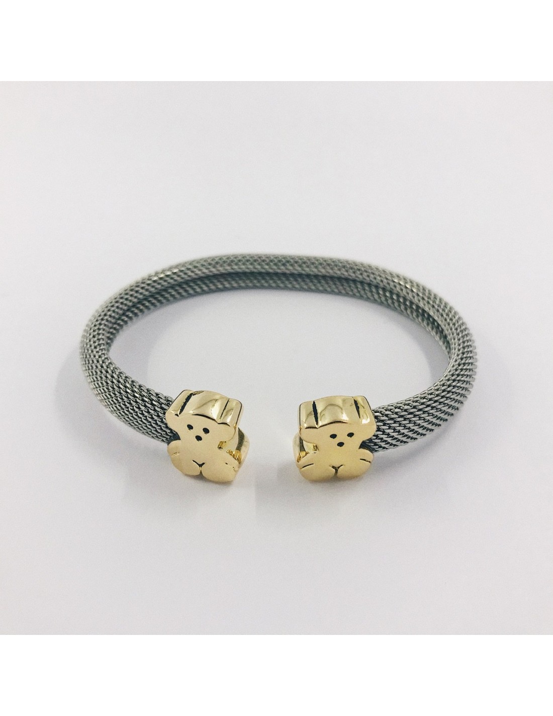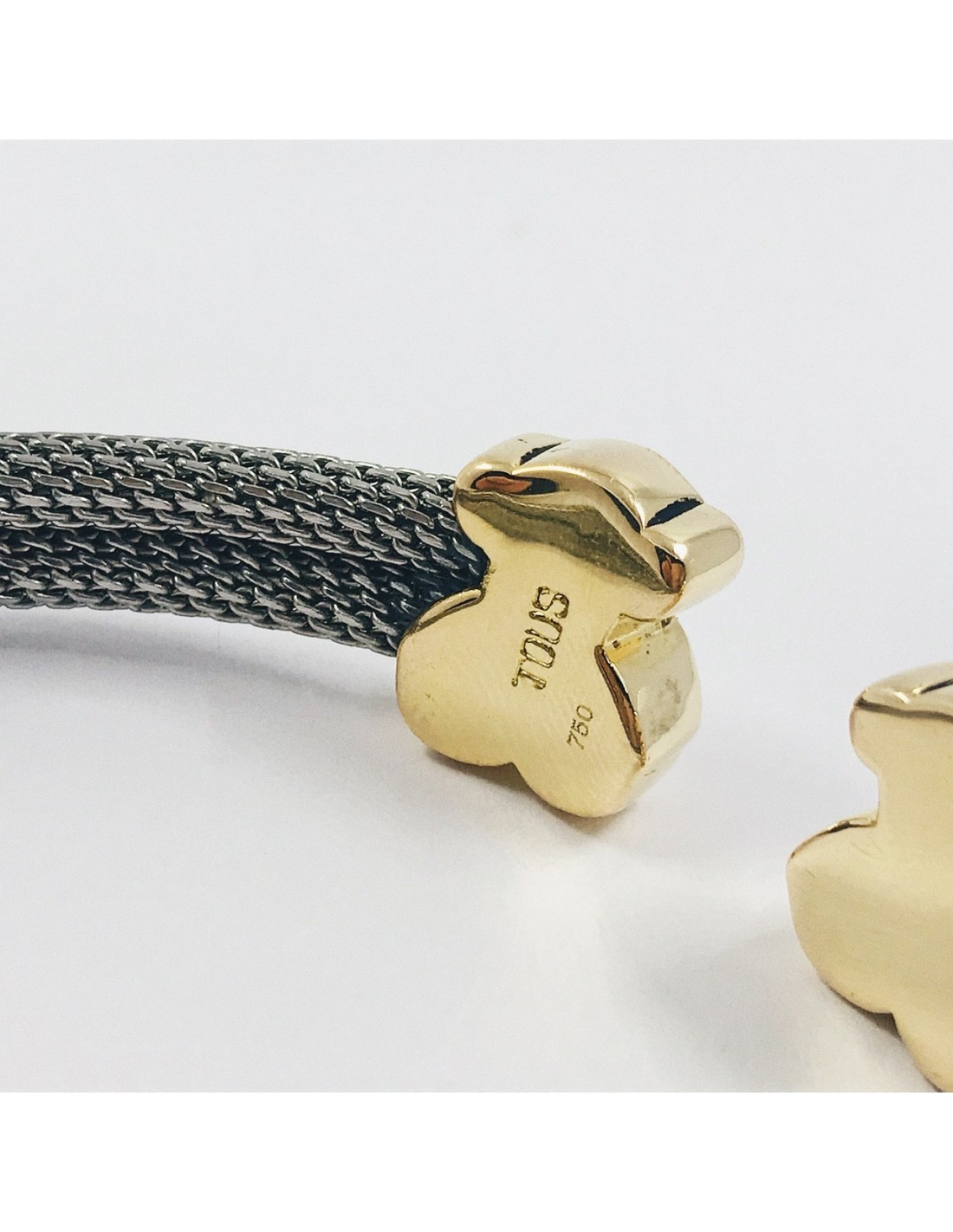 Preciosa pulsera Tous de segunda mano en malla de acero y oro amarillo de primera ley con la icónica figura de la gran firma. Una pieza indispensable para aquellos amantes de Tous. Diámetro: 6cm. Peso: 16,6gr.